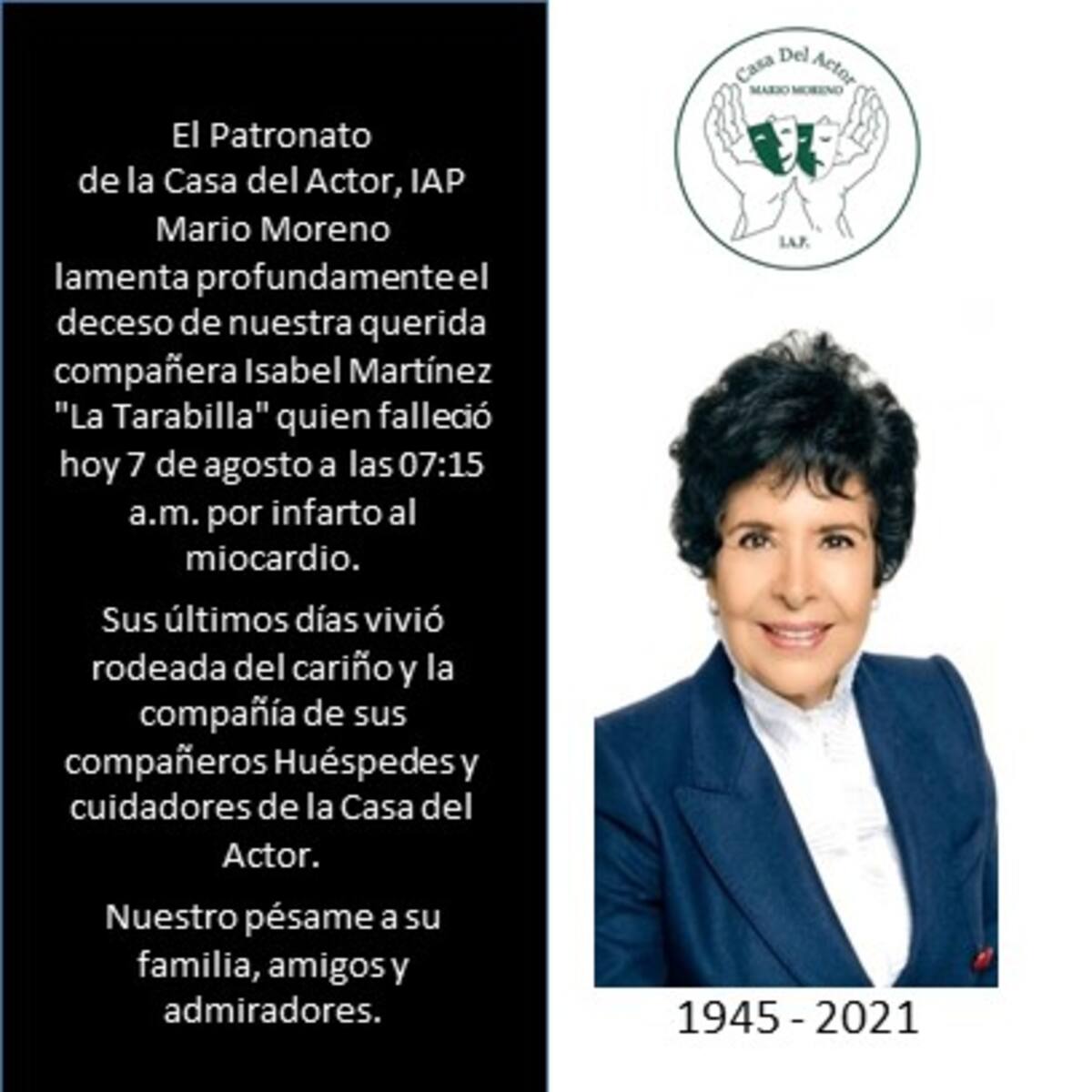CIUDAD DE MÉXICO. - La mañana de este sábado despertamos con una triste noticia: la actriz María Isabel Martínez Moreno, mejor conocida como “La Tarabilla”, falleció a los 74 años de edad.