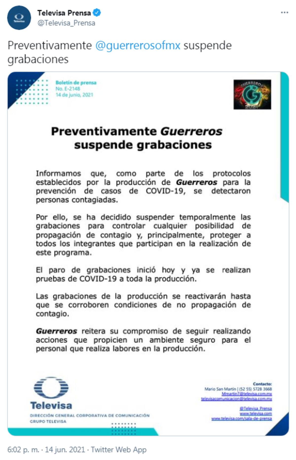 Informamos que, como parte de los protocolos establecidos por la producción de Guerreros para la prevención de casos de COVID-19, se detectaron personas contagiadas. Por ello, se ha decidido suspender temporalmente las grabaciones para controlar cualquier posibilidad de propagación de contagio y, principalmente, proteger a todos los integrantes que participan en la realización de este programa”, se lee en el comunicado.