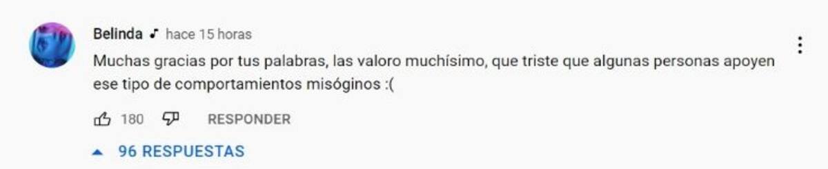 “Muchas gracias por tus palabras, las valoro muchísimo, que triste que algunas personas apoyen ese tipo de comportamientos misóginos“, escribió en Youtube.