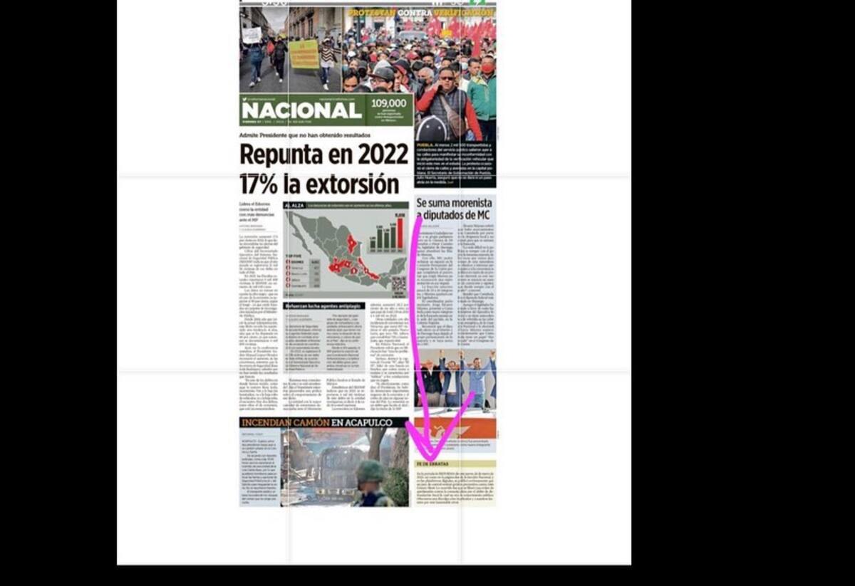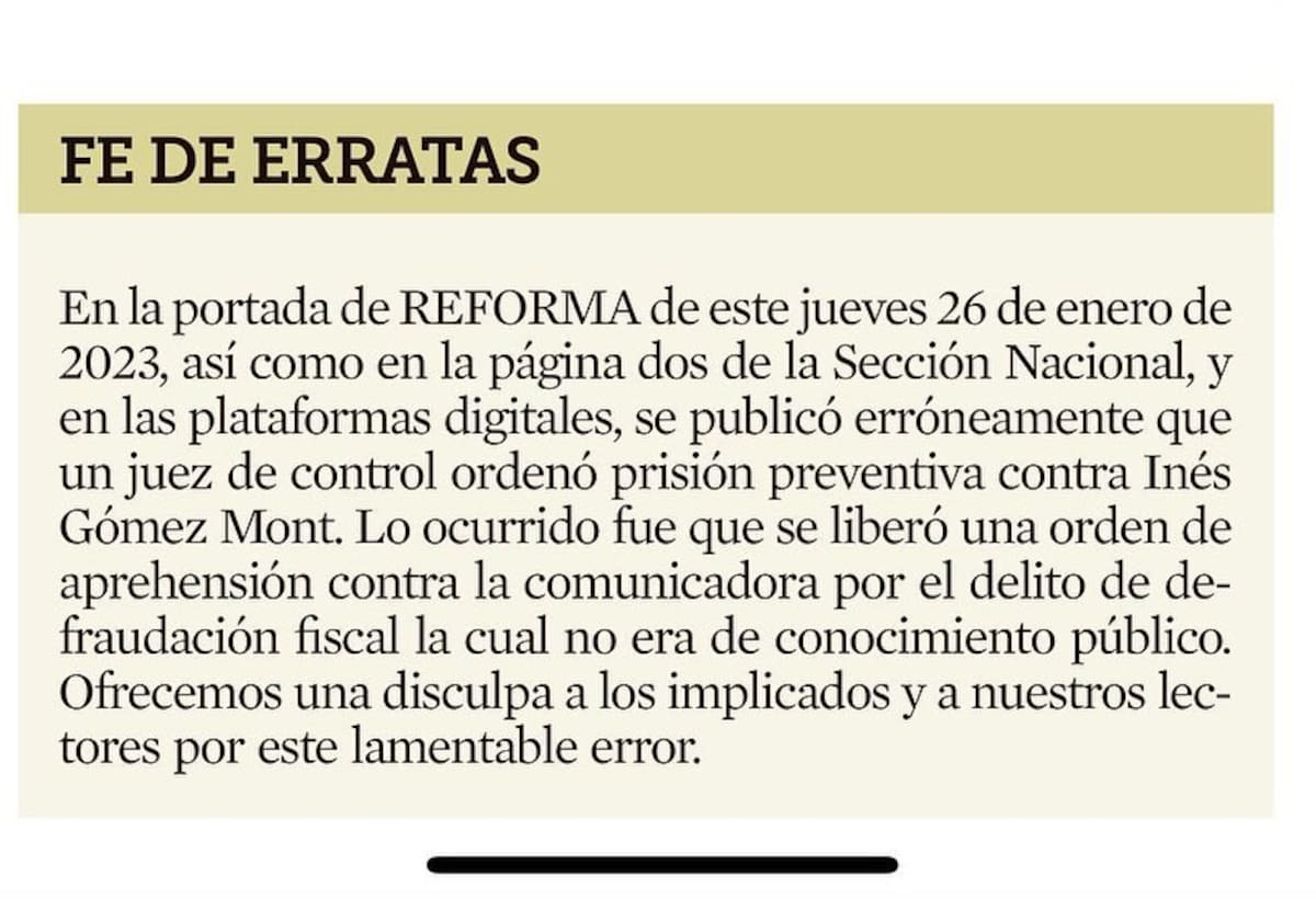 Lo ocurrido fue que se liberó una orden de aprehensión (en realidad desde el 2021) contra la comunicadora por el delito de defraudación fiscal la cual no era de conocimiento público. Ofrecemos una disculpa a los implicados y a nuestros lectores por este lamentable error”, escribieron en la portada del diario “Reforma”.