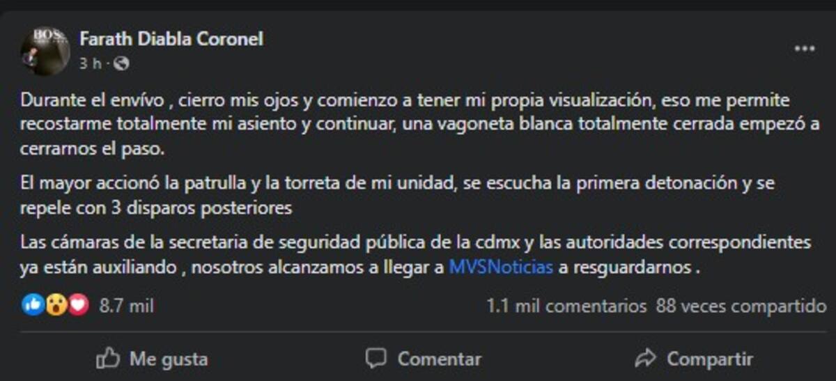 “El mayor accionó la patrulla y la torreta de mi unidad, se escucha la primera detonación y se repele con 3 disparos posteriores”, agregó.