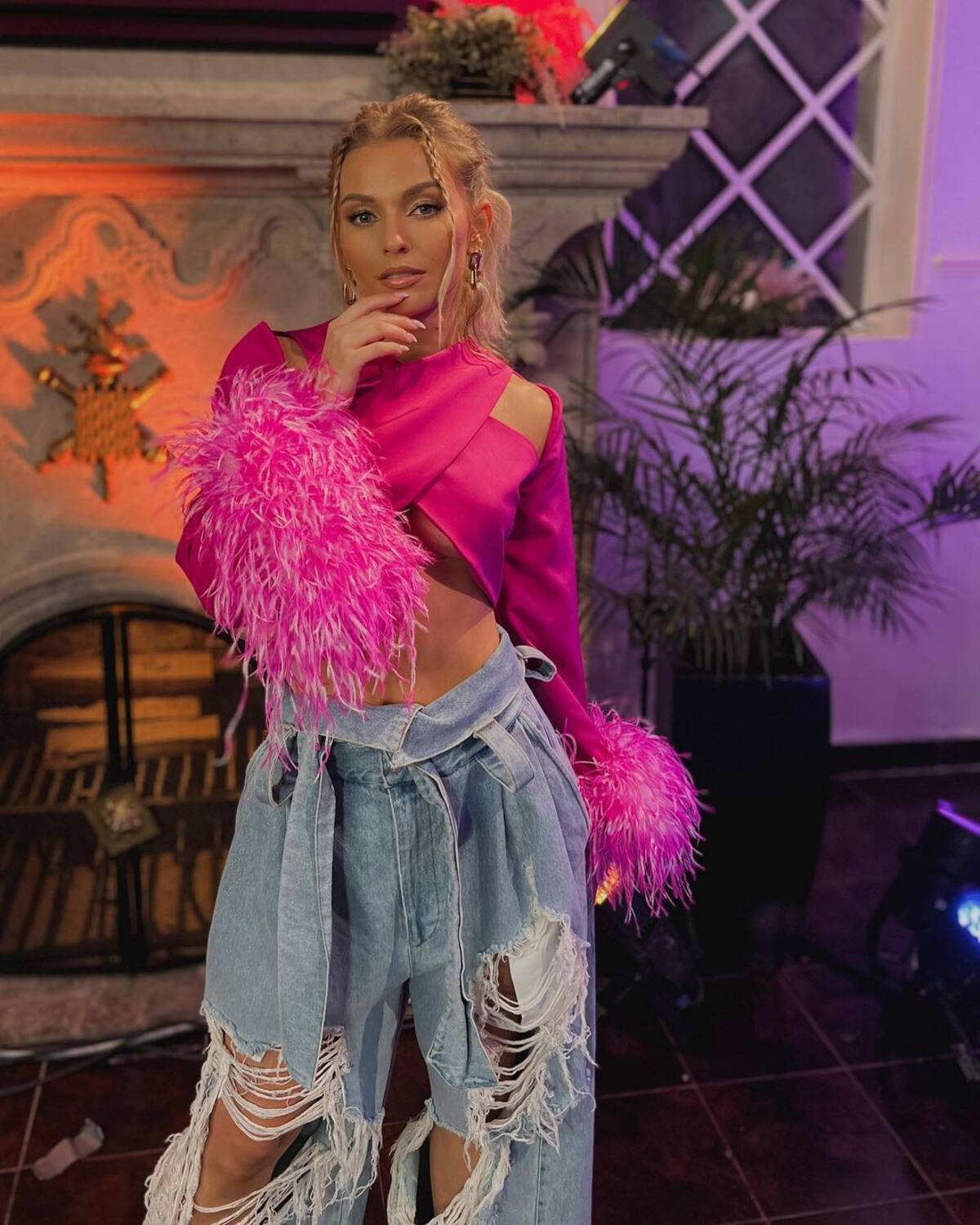 La famosa, nacida en Rusia, apareció a cuadro con una blusa rosa mexicano de manga larga y plumaje, así como los ya mencionados pantalones de mezclilla azul deslavado y varias aberturas.