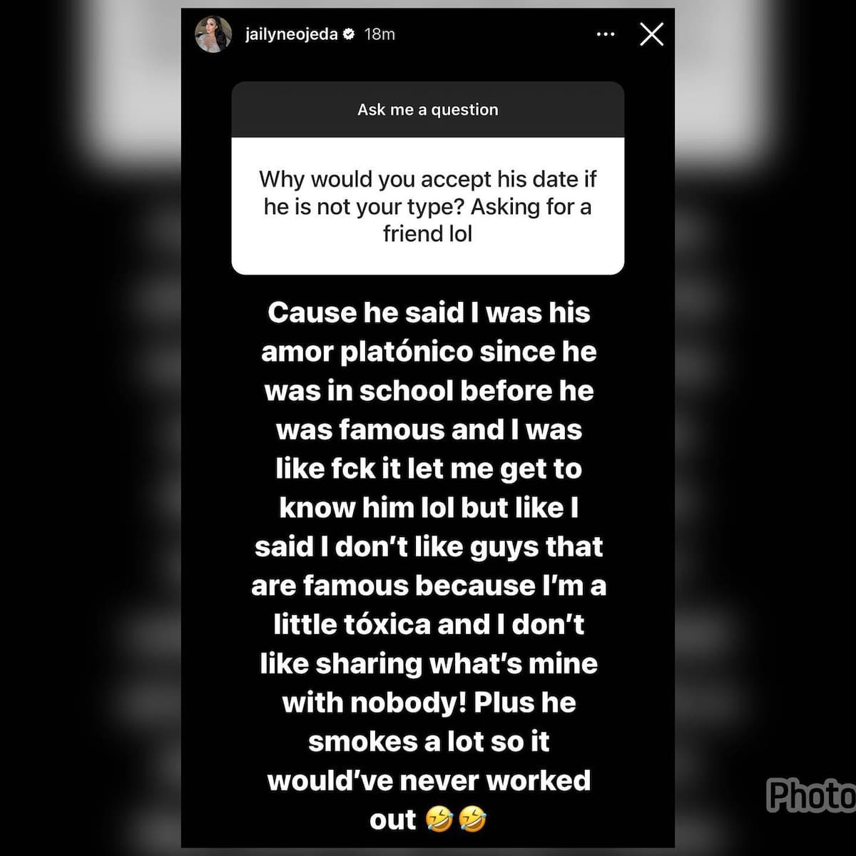 Me invitó a una cita a Disney y eso fue todo. Nunca me acosté con él como todo el mundo piensa, me dejó usar su chaqueta porque me estaba congelando en Disney y se la devolví al día siguiente cuando hicimos el video musical. Eso es todo”, explicó Jailyne Ojeda.