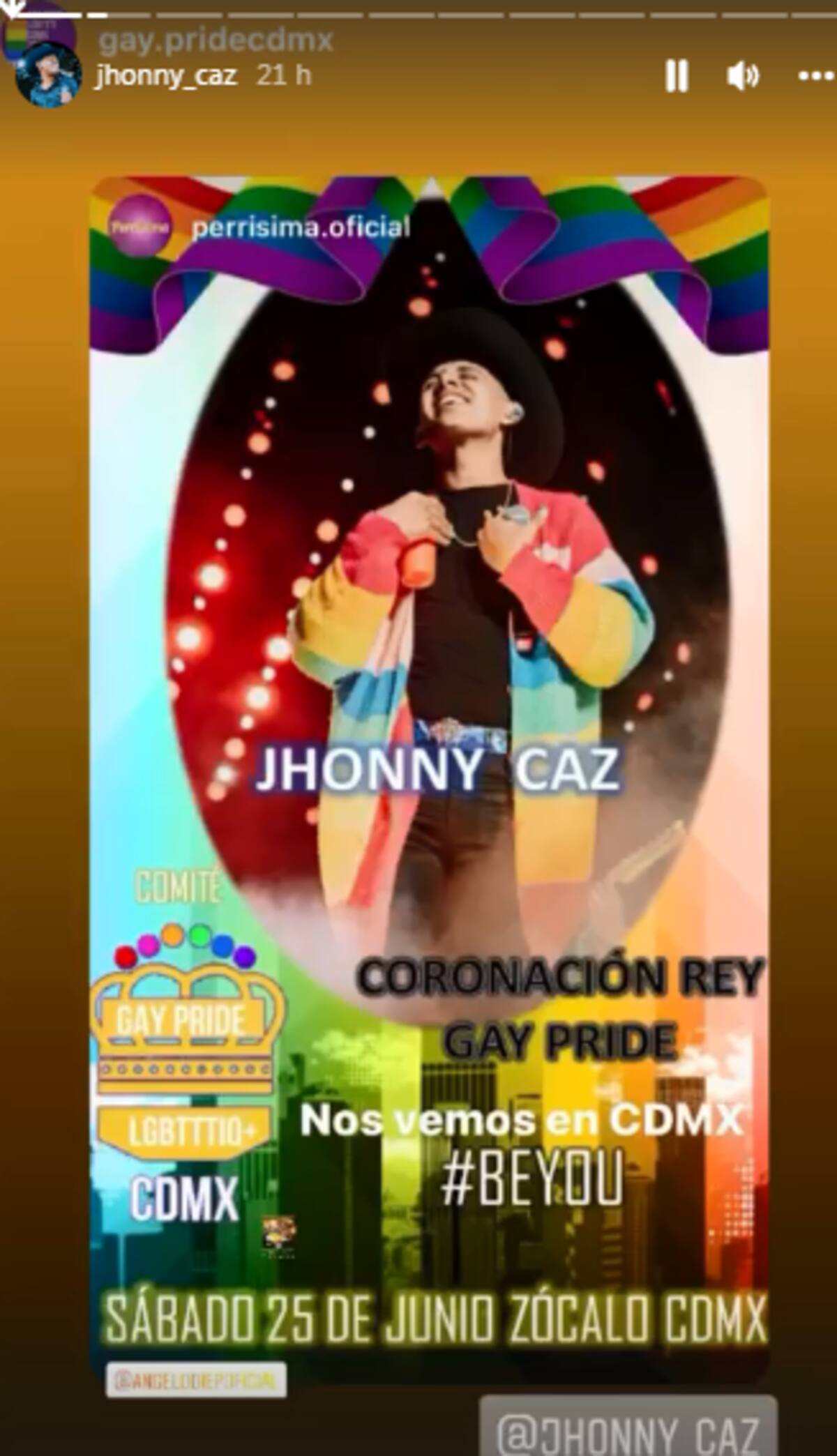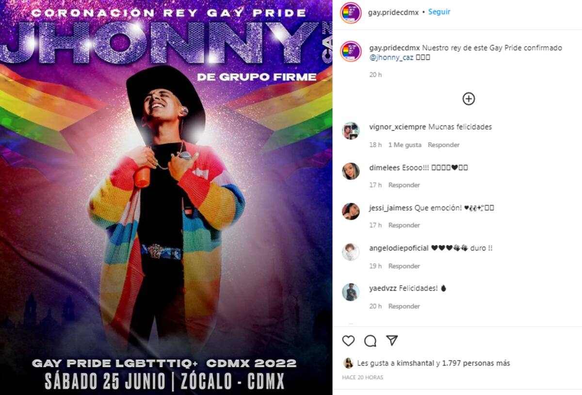 Ciudad de México.- Jhonny Caz, integrante de Grupo firme y hermano de la voz principal, Eduin, no aguantó la emoción y compartió con sus fieles seguidores que será coronado como Rey del Gay Pride LGBT+ de la Ciudad de México 2022.