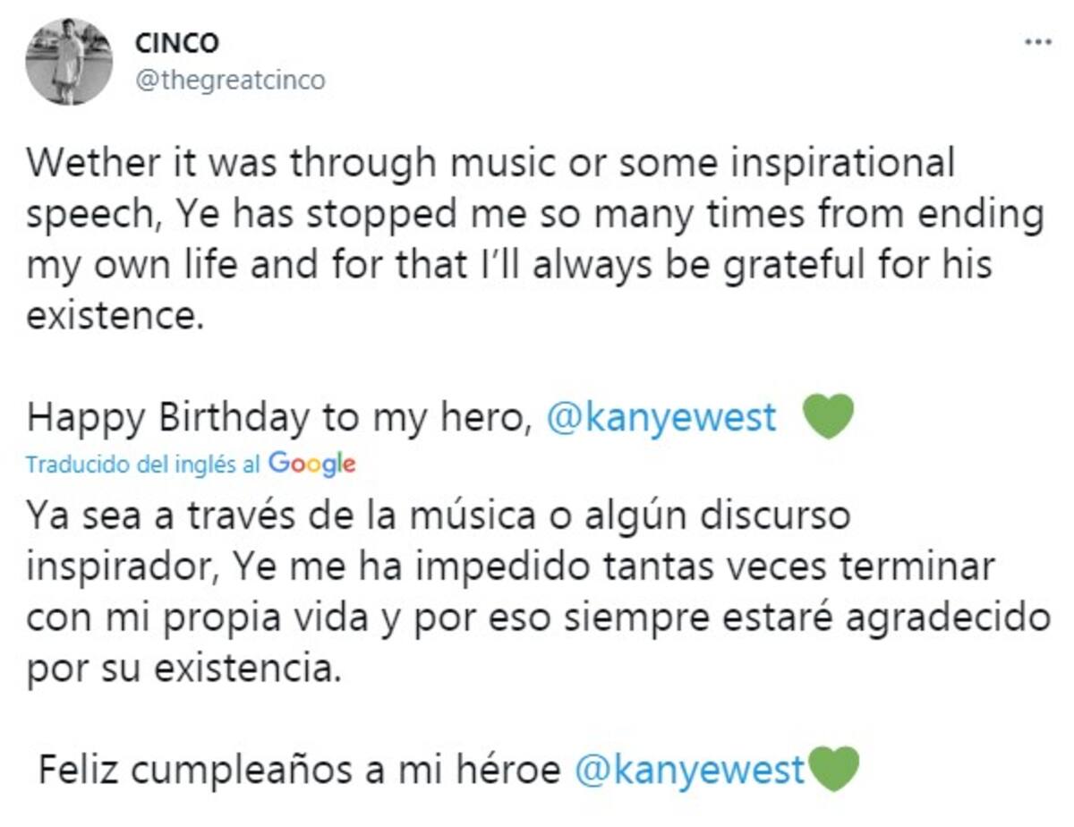 Y es que a través de su cuenta de Twitter, Johnny escribió: “Ya sea a través de la música o algún discurso inspirador, Ye me ha impedido tantas veces terminar con mi propia vida y por eso siempre estaré agradecido por su existencia. Feliz cumpleaños a mi héroe Kanye West”.