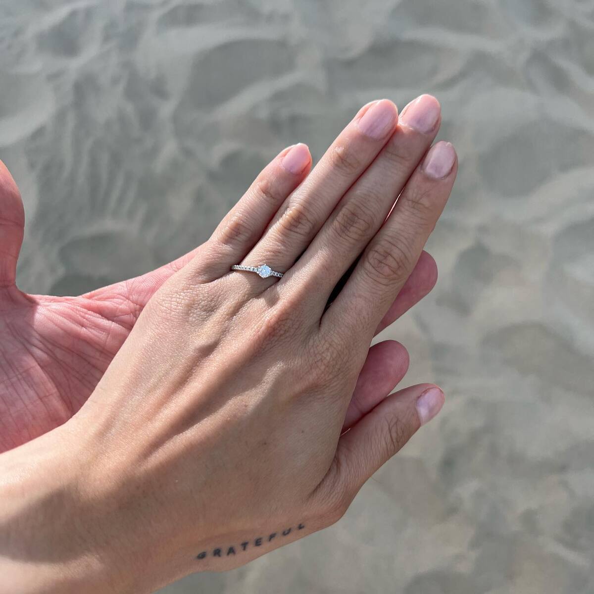 Después de aceptar que dará otro paso con el famoso, Julián Gil le colocó en su mano un anillo de joyería clásica, que tenía un diamante en corte brillante redondo, acompañado de una churumbela.