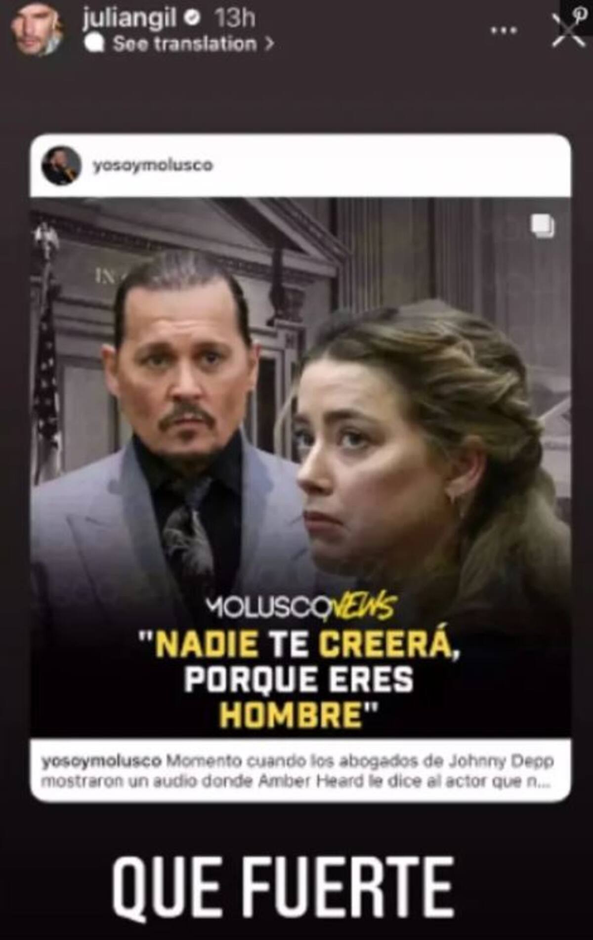 Finalmente, Julián ha sido contundente sobre su posición ante la situación que están viviendo los actores Johnny Depp y Amber Heard, y lo dejó claro en su historia de su cuenta oficial de Instagram.