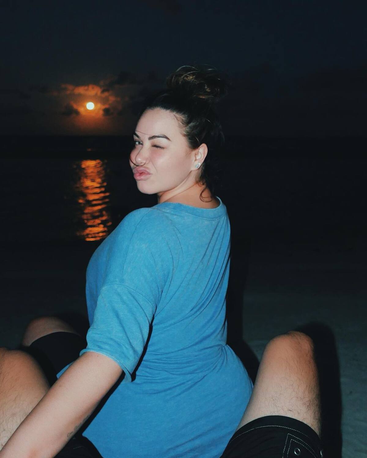 Sin embargo, en otra foto se ve a la hija de Jenni Rivera sentada entre las piernas de su novio, mientras le coquetea. Ambos están observando el mar a la luz de la luna.