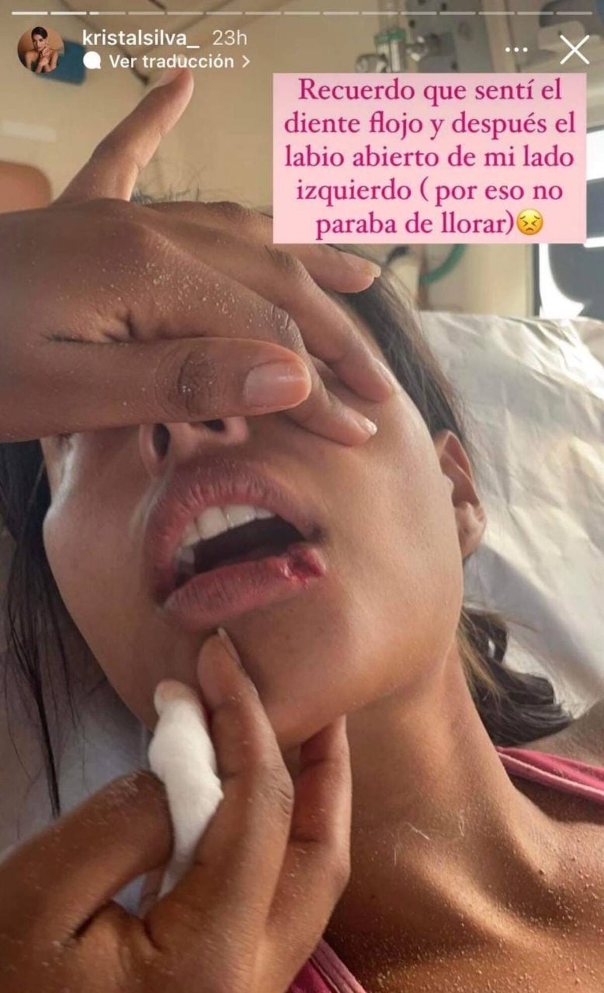 En la imagen podemos ver el labio partido de Kristal, junto a una descripción en la que nos hace saber que “Recuerdo que sentí el diente flojo y después el labio abierto de mi lado izquierd (por eso no para de llorar)”.