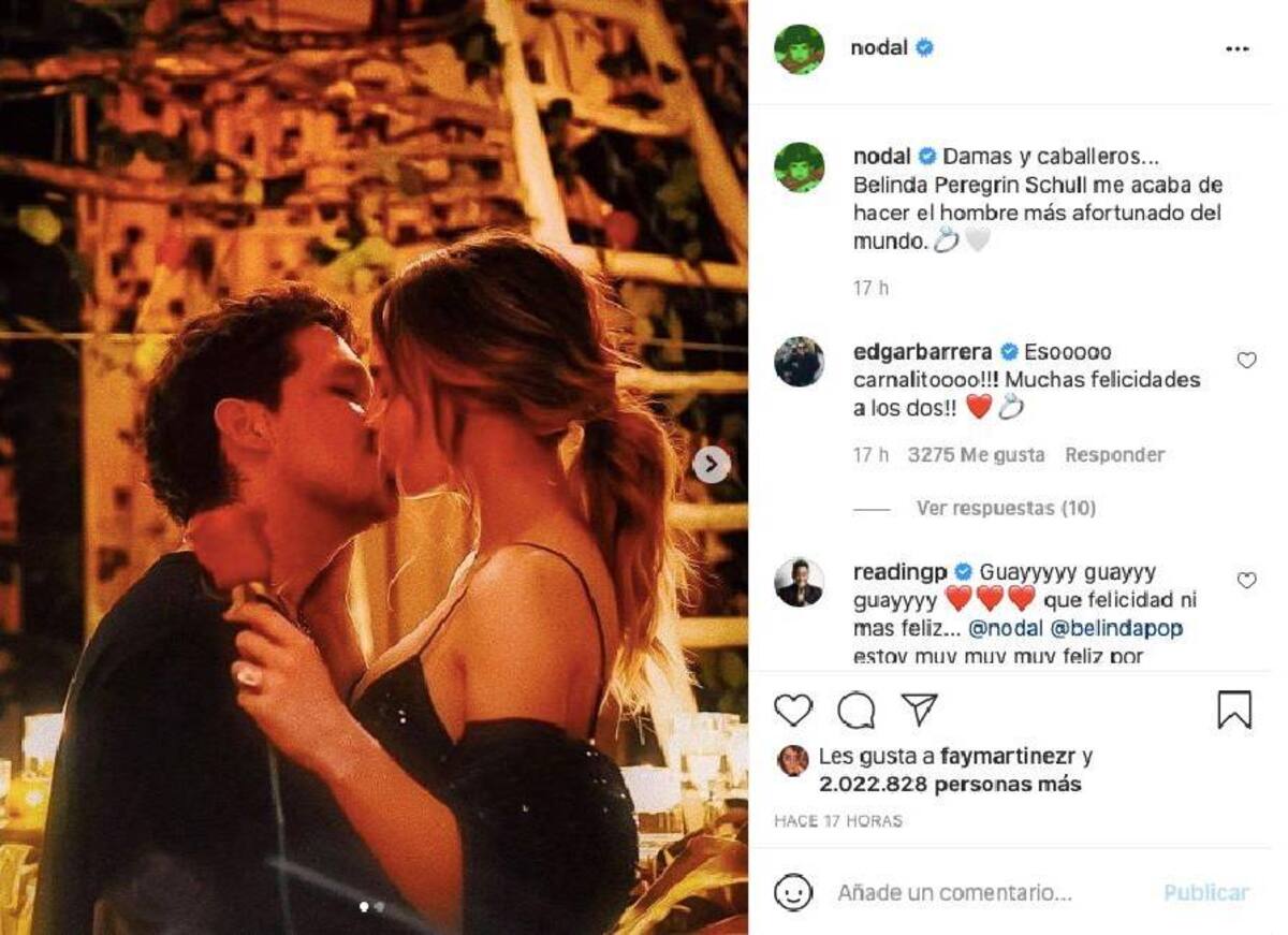Los cantantes Belinda y Christian Nodal se comprometieron el 24 de mayo de 2021, en un exclusivo restaurante de Barcelona, donde el artista de Sonora le entregó un anillo valorado en tres millones de dólares.