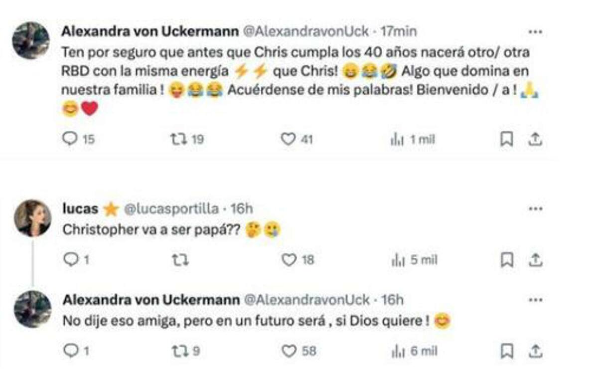 A través de su cuenta de Twitter, Alexandra escribió: "Ten por seguro que antes que Chris cumpla los 40 años nacerá otro/otra RBD con la misma energía que Chris. ¡Algo que domina en nuestra familia! ¡Acuérdense de mis palabras! ¡Bienvenido/a!".