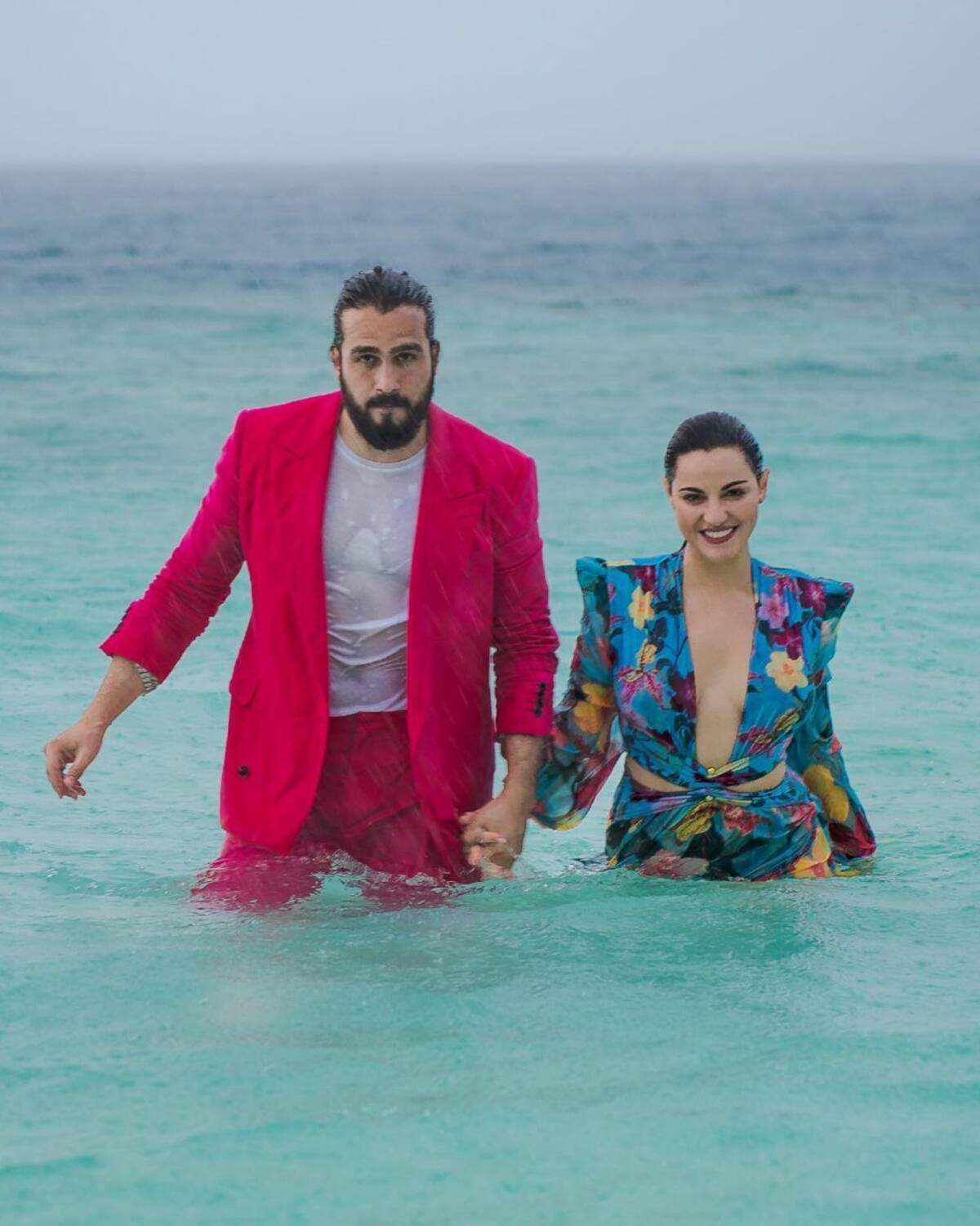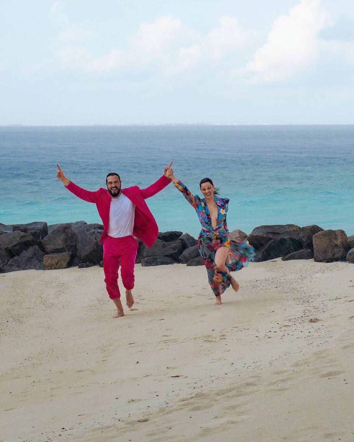 Ambos decidieron disfrutar de una hermosa playa, mientras se toman de sus manos. Los "novios" tienen una hermosa sonrisa que exhibe la felicidad que tienen después de dar el siguiente paso en su relación.