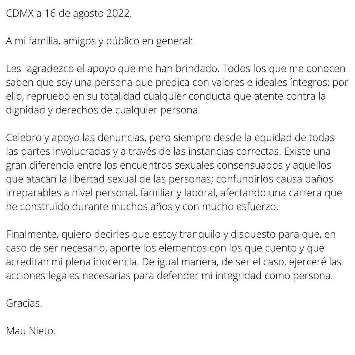 Existe una gran diferencia entre los encuentros sexuales consensuados y aquellos que atacan la libertad sexual de las personas; confundirlos causa daños irreparables a nivel personal, familiar y laboral, afectando una carrera que he construido durante muchos años y con mucho esfuerzo”, expresó Mau Nieto en su mensaje.