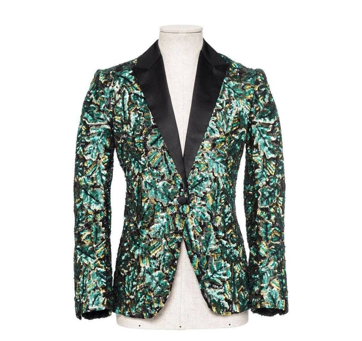 Una de las chamarras que donó Jagger está bordada con lentejuelas color verde, con diseños de hojas de roble, la cual usó en 2013 en el festival de música de Glastonbury.