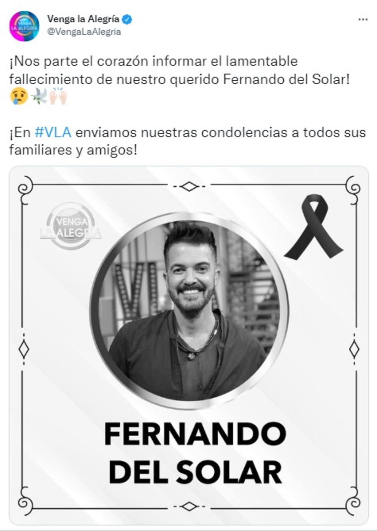 ¡Nos parte el corazón informar el lamentable fallecimiento de nuestro querido Fernando del Solar! ¡En #VLA enviamos nuestras condolencias a todos sus familiares y amigos!”, escribieron en Twitter.