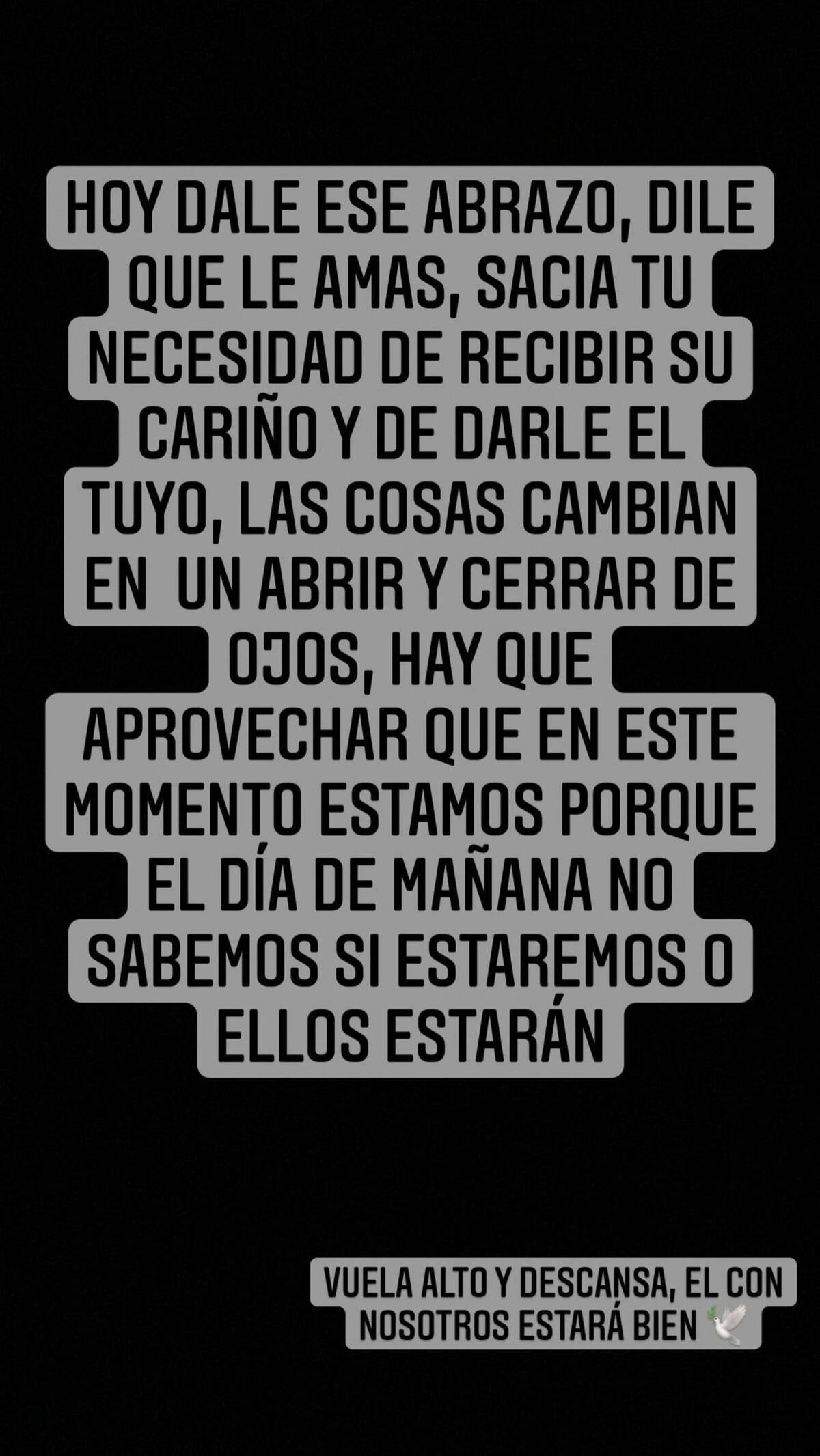 Por su parte, Jhonny Caz escribió: “Hoy dale ese abrazo, dile que le amas, sacia tu necesidad de recibir su cariño y de darle el tuyo. Las cosas cambian de un abrir y cerrar de ojos, hay que aprovechar que en este momento estamos porque el día de mañana no sabemos si estaremos o ellos estarán. Vuela alto y descansa, él con nosotros estará bien”.