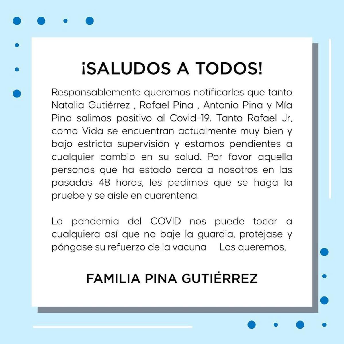 ¡Saludos a todos! Responsablemente queremos notificarles que tanto Natalia Gutiérrez , Rafael Pina , Antonio Pina y Mía Pina salimos positivo al Covid-19. Tanto Rafael Jr, como Vida se encuentran actualmente muy bien y bajo estricta supervisión y estamos pendientes a cualquier cambio en su salud”, dice el comunicado.