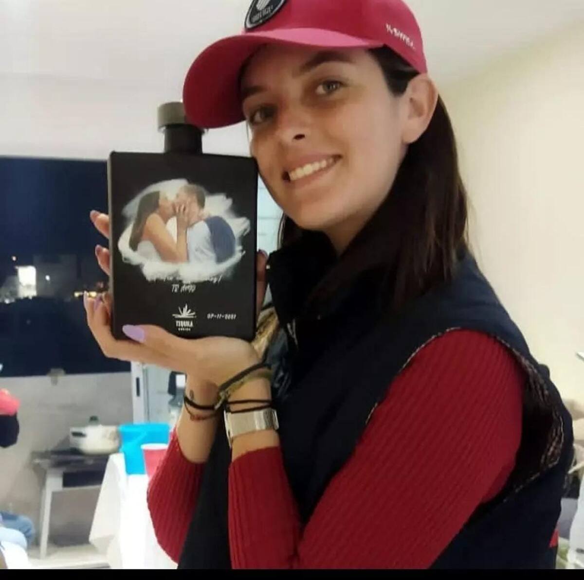 Entre los regalos también nos podemos encontrar con una botella de tequila adornada por una imagen de la pareja, donde aparecen dándose un gran beso, escribiendo “A tu salud mi amor, te amo”.