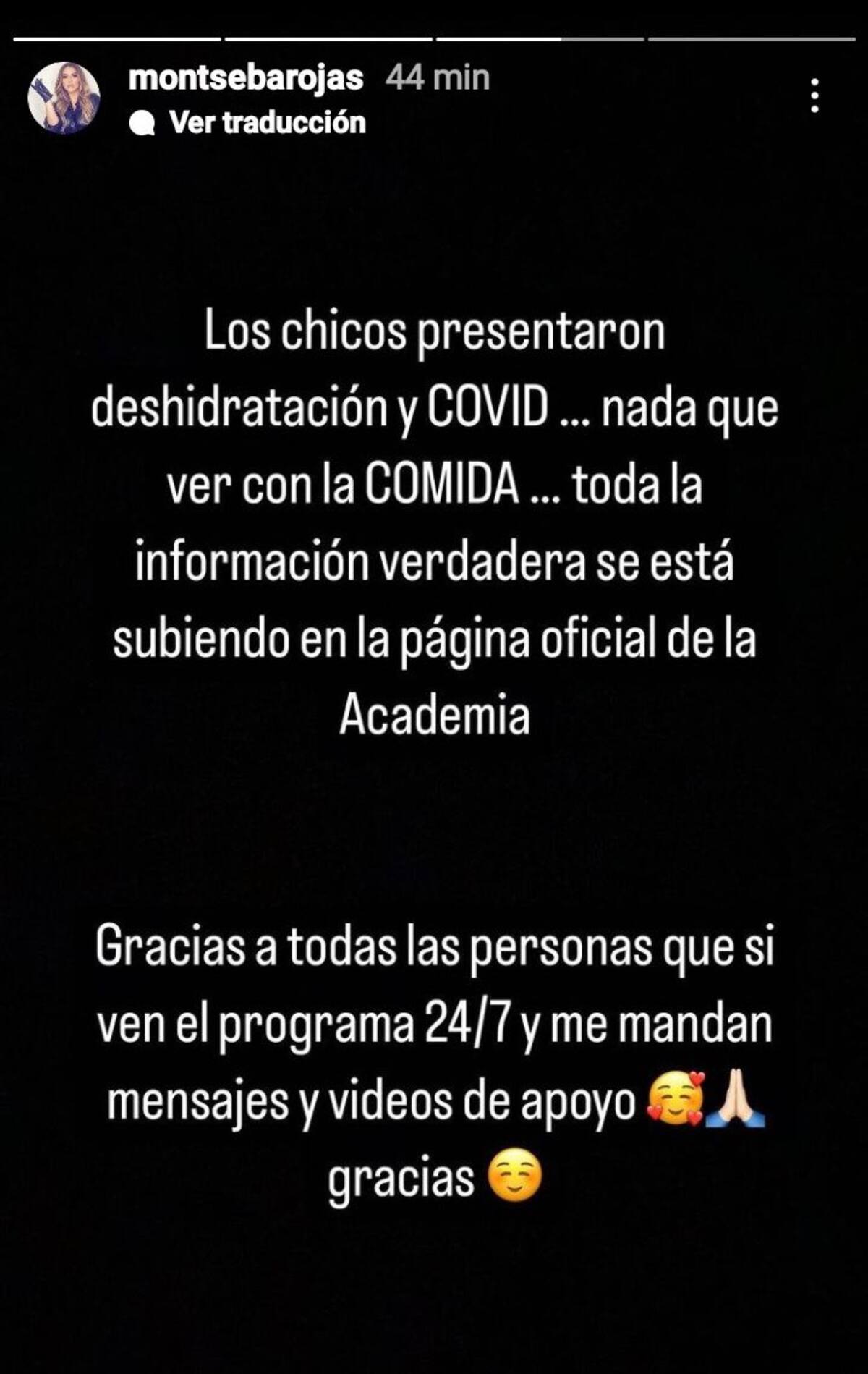 “Los chicos presentaron deshidratación y covid-19… Nada que ver con la comida… Toda la información verdadera se está subiendo a la página oficial de ‘La Academia’”, comunicó al momento que agradeció las muestras de cariño de sus fans.