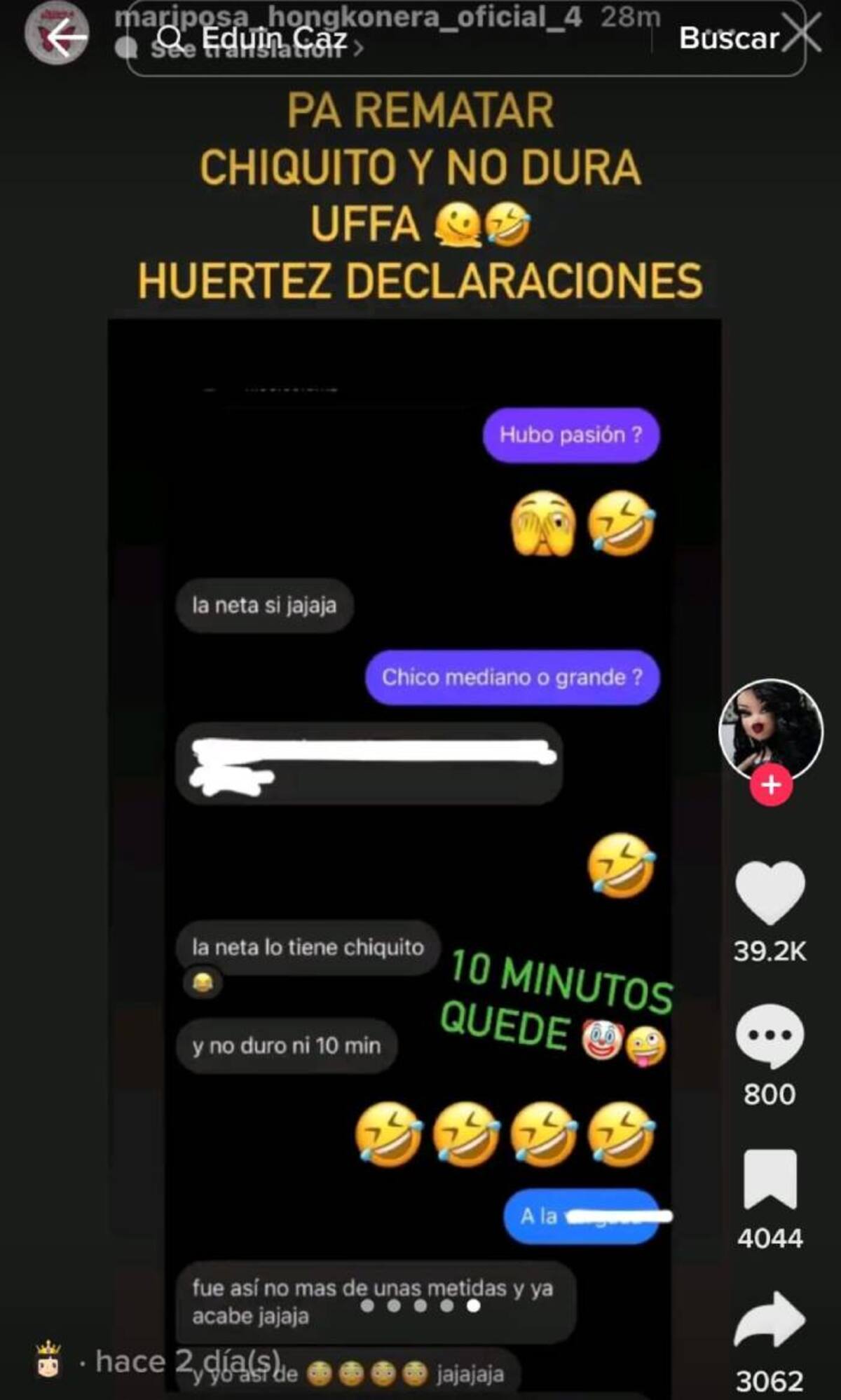 En otras capturas de pantalla, la amante le hace saber a otra persona que tuvo un encuentro sexual con Eduin Caz y señala que el rendimiento del famoso no fue muy bueno, pues hasta argumentó que tenía su miembro pequeño.