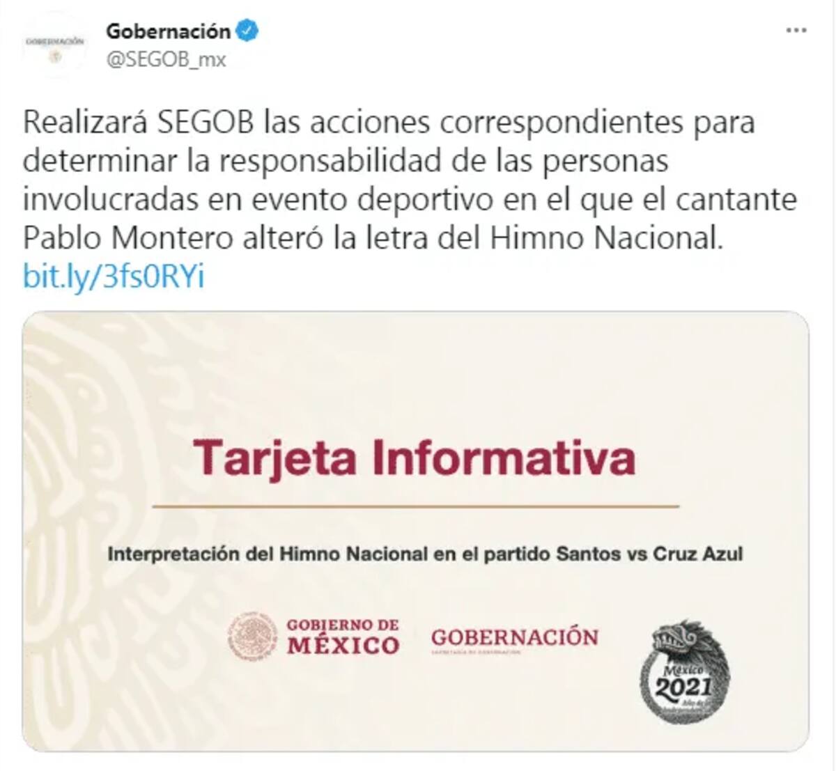 MÉXICO.- La Secretaría de Gobernación comunicó que, tras las equivocaciones realizadas por el cantante Pablo Montero durante su interpretación del Himno Nacional Mexicano en la ceremonia previa a la final de la Liga MX, analizarán aplicar sanciones en su contra.