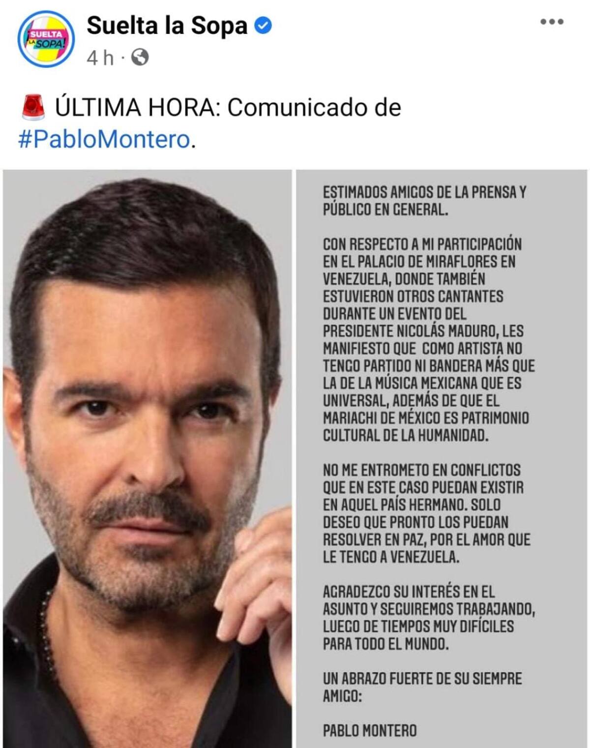 Ante las acusaciones, el actor compartió a través de sus redes sociales un comunicado en el que podemos leer “Con respecto a mí participación en el Palacio de Miraflores en Venezuela, donde también estuvieron otros cantantes durante un evento del presidente Nicolás Maduro, les manifiesto que como artista no tengo partido ni bandera más que de la música mexicana que es universal, además de que el mariachi de México es patrimonio cultural de la humanidad”.