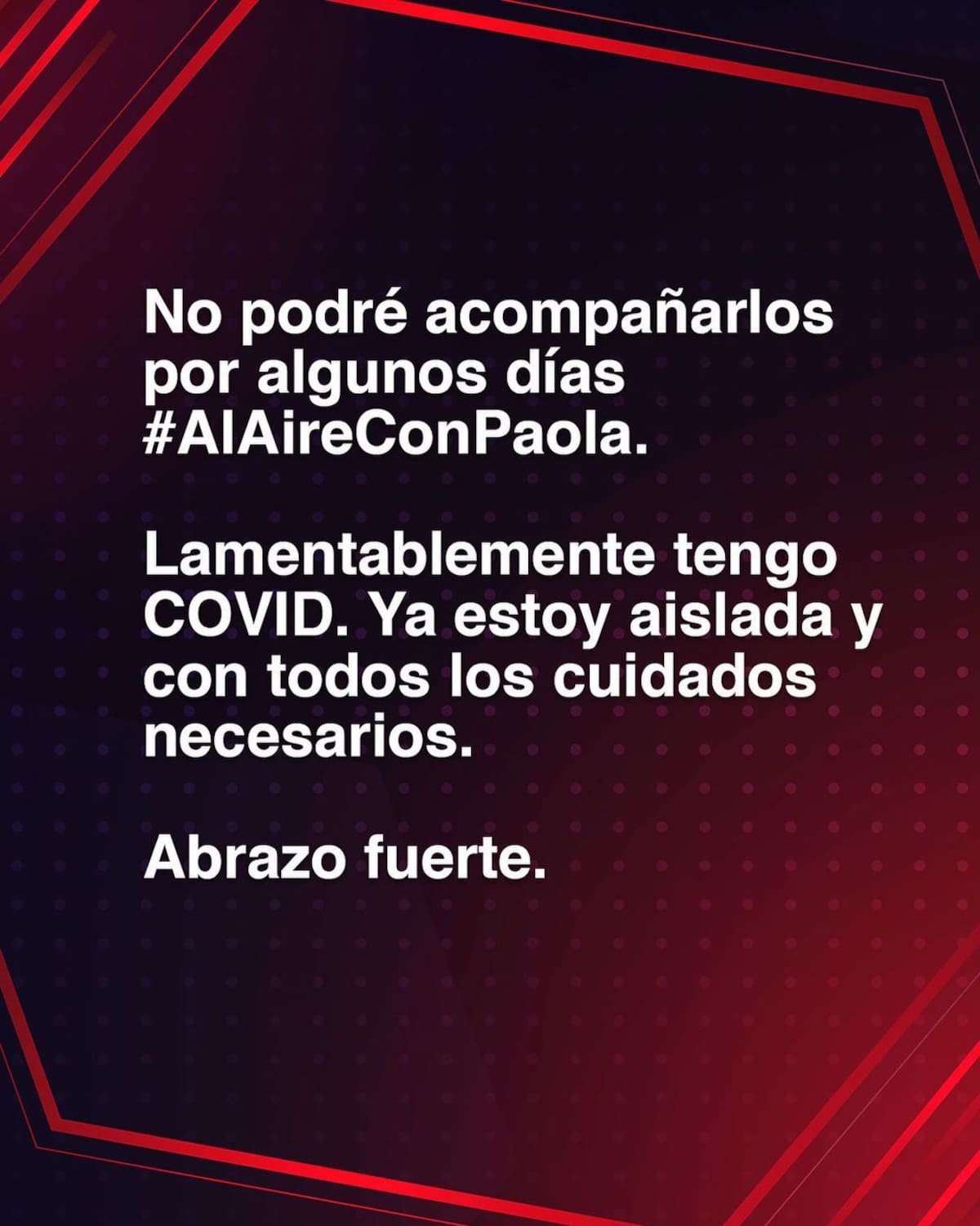 No podré acompañarlos por algunos días #AlAireConPaola. Lamentablemente tengo Covid. Ya estoy aislada y con todos los cuidados necesarios. Abrazo fuerte”, escribió la periodista.