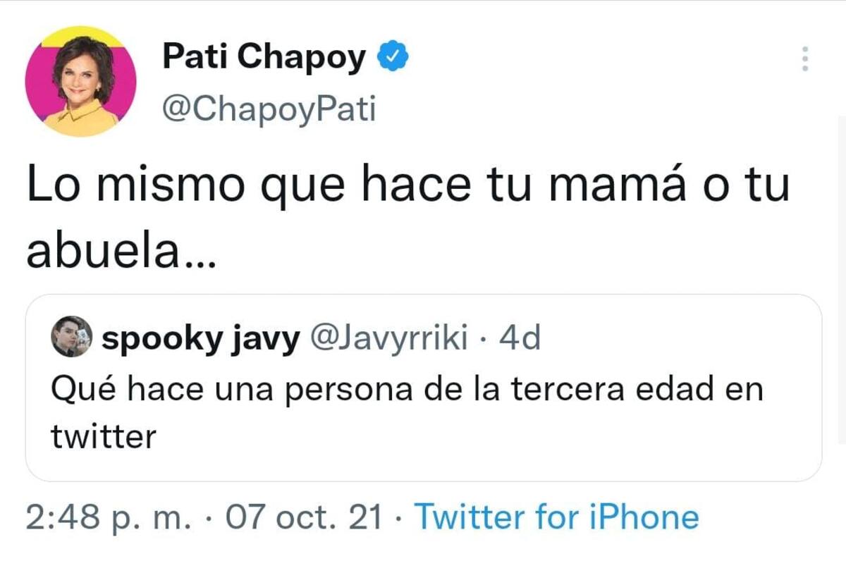 La respuesta de Chapoy no se hizo esperar, contestándole al tuitero que “Lo mismo que hace tu mamá o tu abuela…”, lo que a su vez generó más reacciones de los internautas.