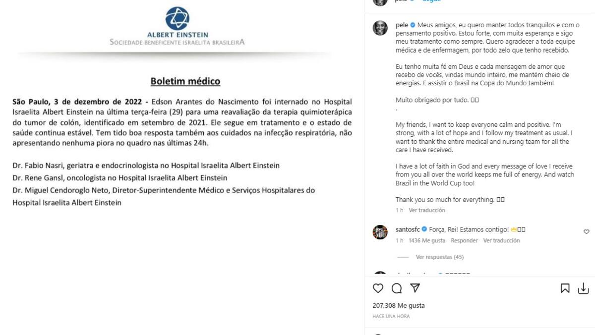 Este mensaje fue acompañado por el parte médico del Hospital Albert Einstein de Sao Paulo, donde se detalló que Pelé se encuentra internado desde el pasado martes, 29 de noviembre. De igual manera, el centro hospitalario detalló que el famoso se sometió a una revisión del tratamiento de quimioterapia del tumor de colón que le fue detectado en 2021.