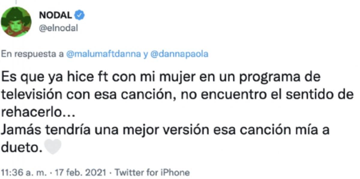 Tengo una idea, vamos a hacer algo. Te voy a enviar un video tocando el piano o la guitarra con la melodía de ‘De los besos que te di’, entonces te pones los audífonos y grabas tu voz con un video y me lo mandas. Luego yo me monto grabando la voz y la guitarra y hacemos un dueto virtual”, le comentó Nodal a Danna, aunque dicho plan nunca se concretó.