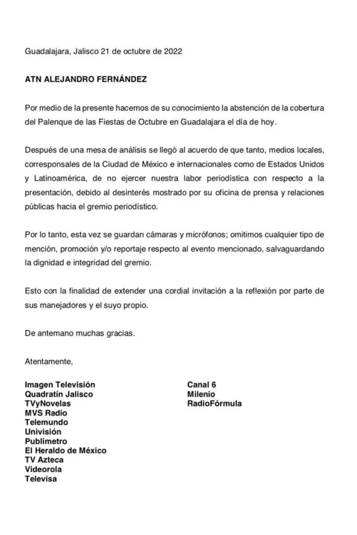 “Después de una mesa de análisis, se llegó al acuerdo de que tanto medios locales, corresponsales de la Ciudad de México e internacionales como de Estados Unidos y Latinoamérica, de no ejercer nuestra labor periodística con respecto a la presentación, debido al desinterés mostrado por su oficina de prensa y relaciones públicas hacia el gremio periodístico”, se lee