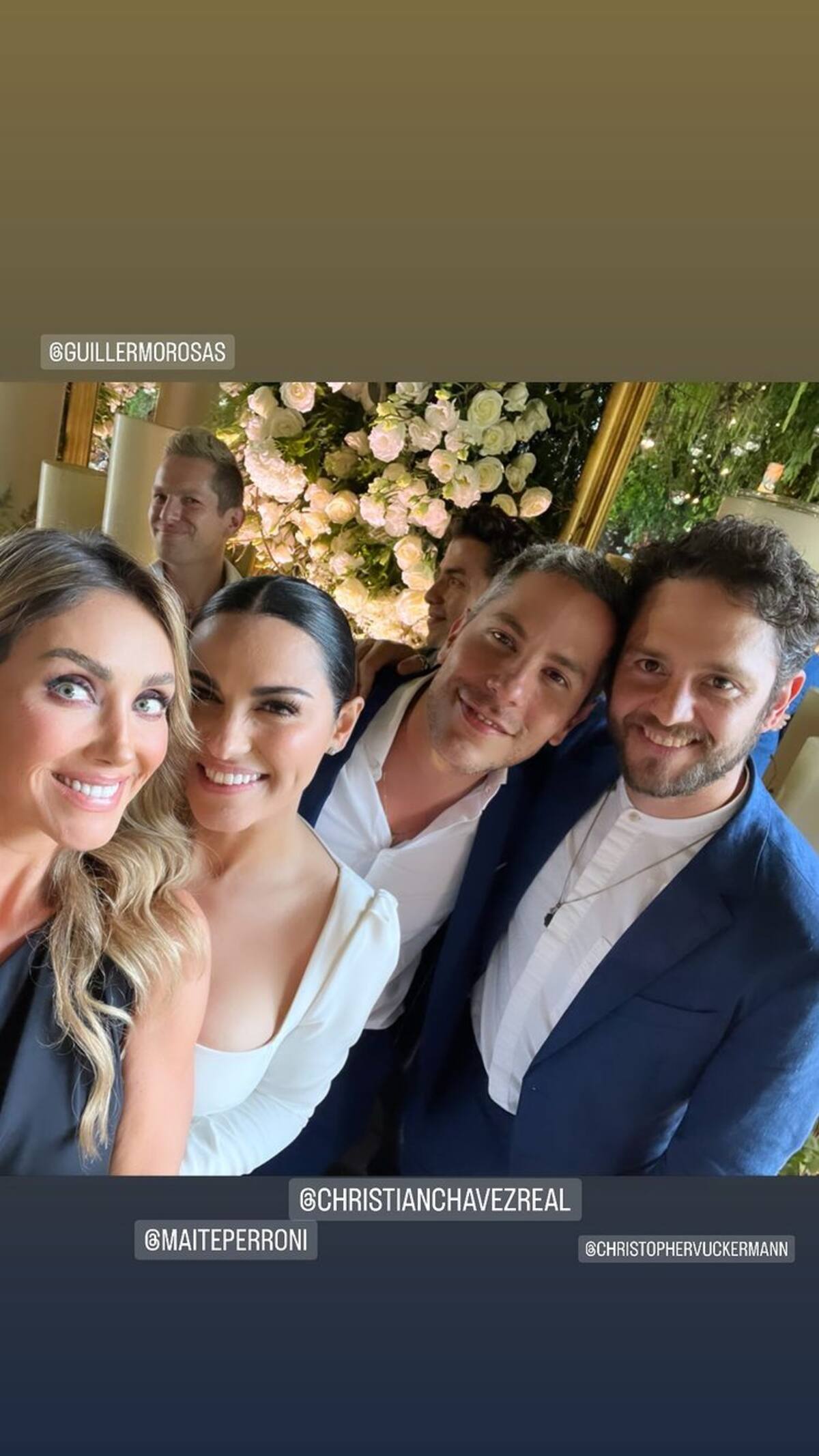 Por medio de la misma plataforma, fue Anahí quien compartió una imagen junto a sus compañeros y escribió: "Aquí estamos, celebrando el amor", en referencia a la boda de Perroni. Pero no todos estuvieron presentes.