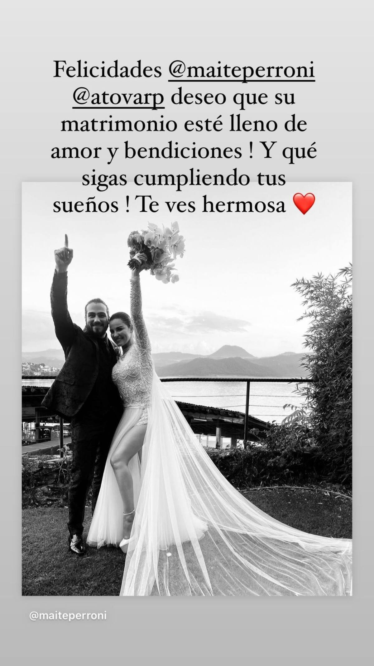 Felicidades, Maite Perroni y Andres Tovar. Deseo que su matrimonio esté lleno de amor y bendiciones; y que sigas cumpliendo tus sueños. Te ves hermosa", expresó.