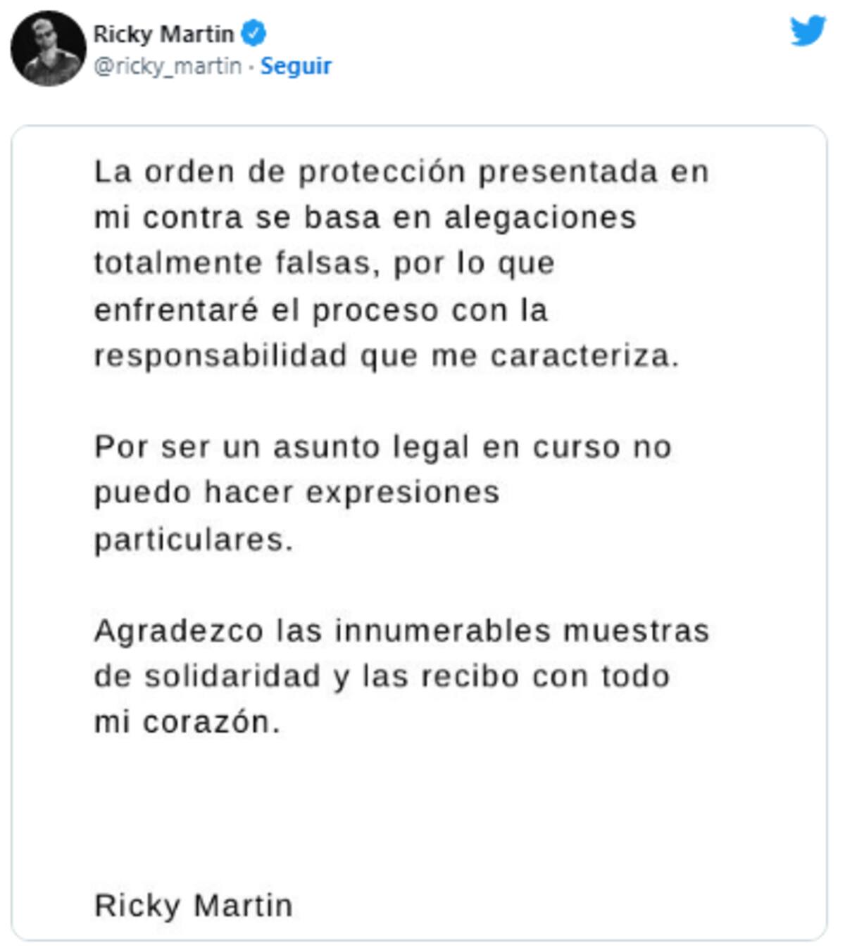 La orden de protección presentada en mi contra se basa en alegaciones totalmente falsas, por lo que enfrentaré el proceso con la responsabilidad que me caracteriza”, expresó Ricky Martin en su cuenta de Twitter.