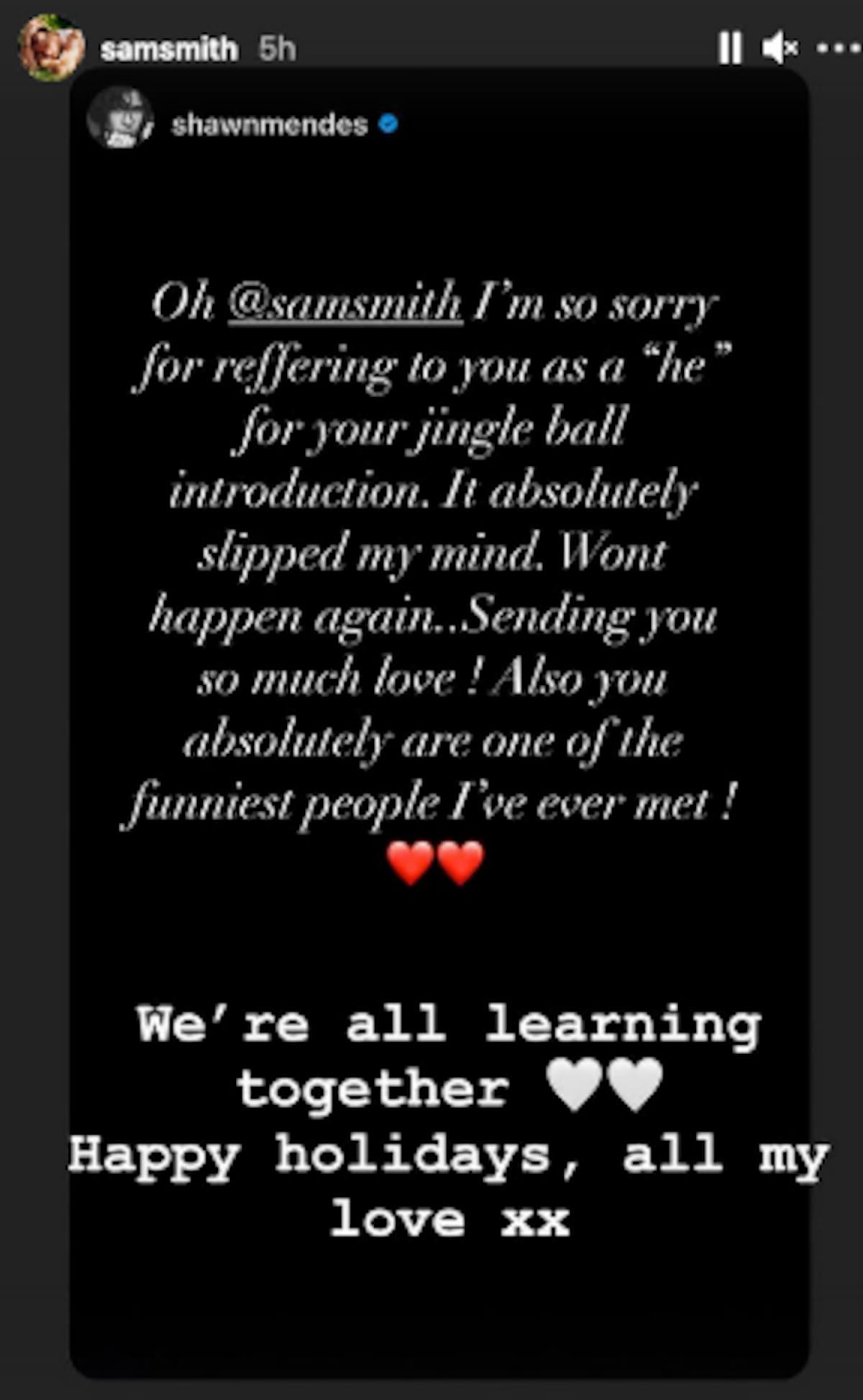 “Oh @samsmith, lamento mucho referirme a ti como un ‘él’ por tu introducción al jingle ball. Se me olvidó por completo. No volverá a suceder... ¡Te mando tanto amor!”, escribió el cantante canadiense por medio de sus historias de Instagram.