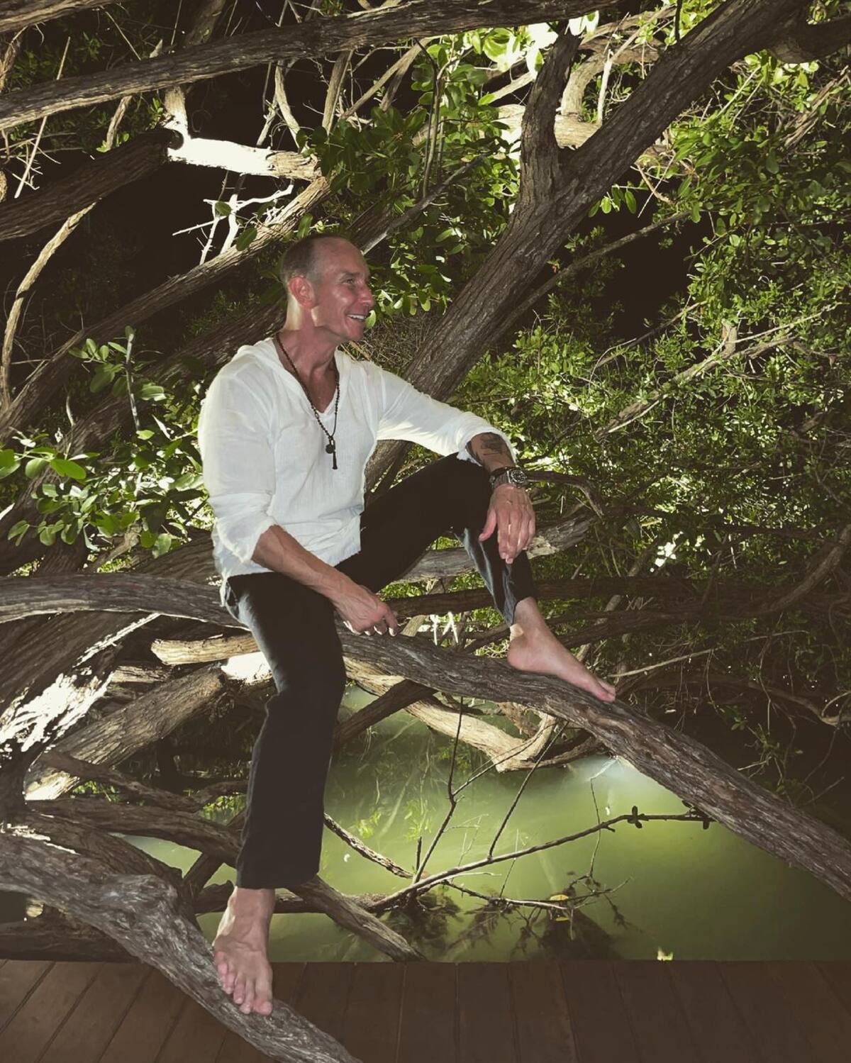 No hay que tomarse la vida tan en serio”, escribió el intérprete de 50 años en el pie de la foto posando en los trancos de un árbol. Incluso, sus hijas y su esposa le comentaron la postal con divertidas frases y emojis.