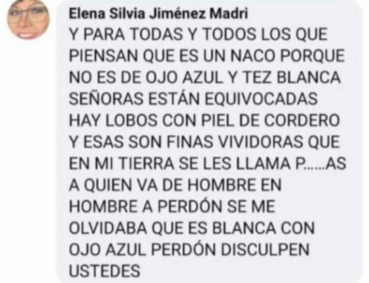 Luego siguió: “Hay lobos con piel de cordero y esas son finas vividoras. En mi tierra se les llaman P&74$, a quien va de hombre en hombre. ¡Ah, perdón! Se me olvidaba que es blanca con ojo azul, perdón, disculpen ustedes”.