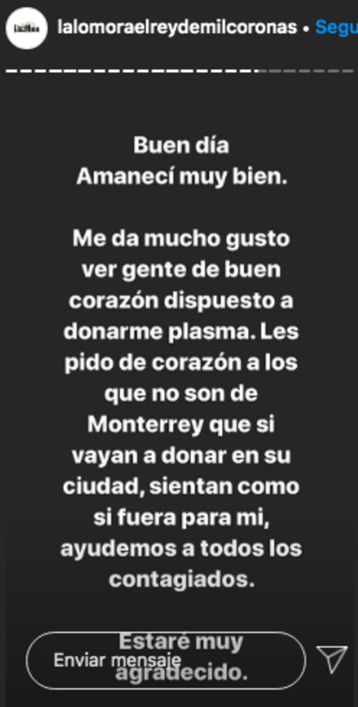 Además, en su cuenta de Instagram, pidieron que quienes no vivan en Monterrey, Nuevo León, donde radica el cantante, vayan a sus correspondientes centros de salud a donar plasma.