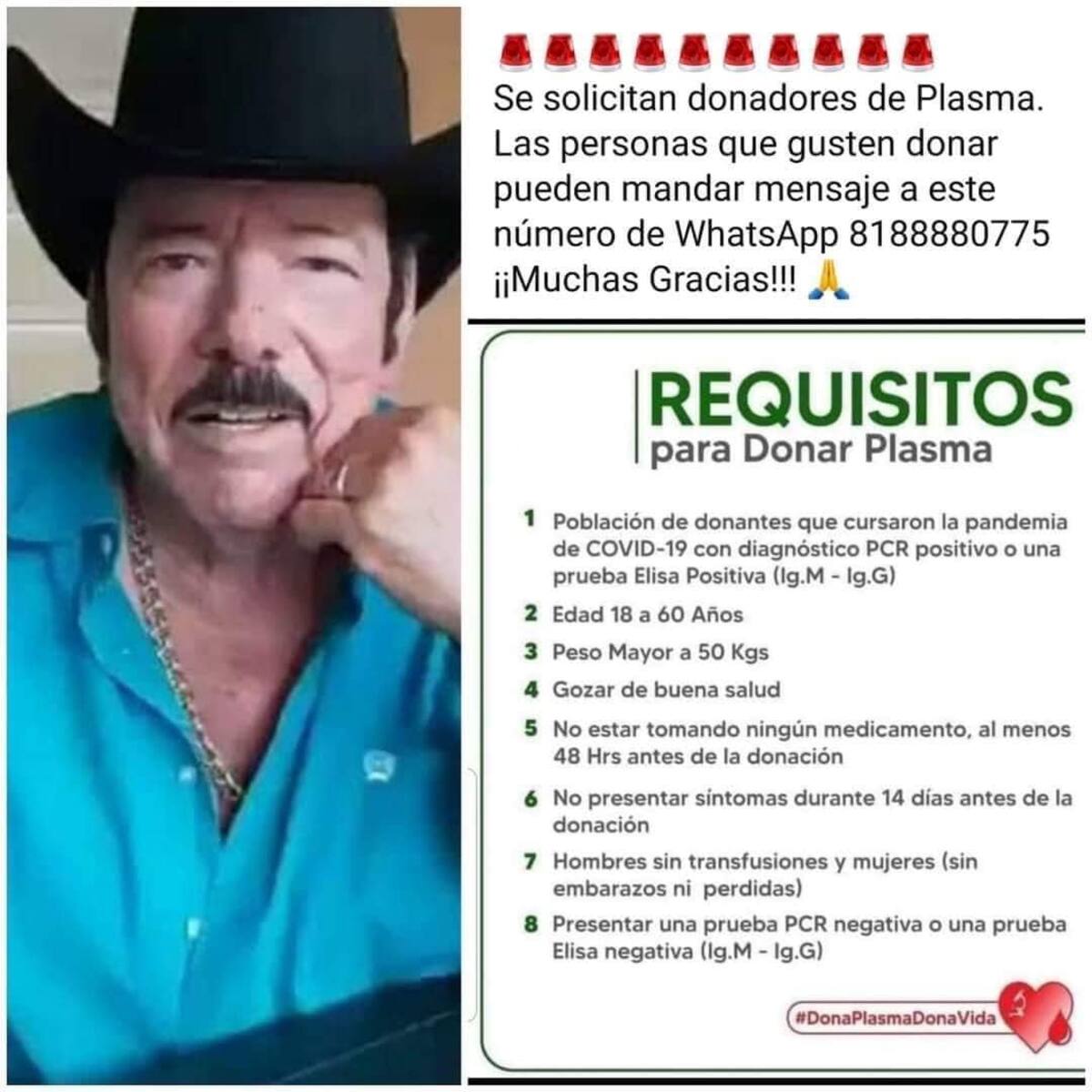 Sin embargo, hoy por la mañana compartieron en redes sociales que estaban solicitando plasma para el intérprete, y adjuntaron los requisitos para poder hacerlo.