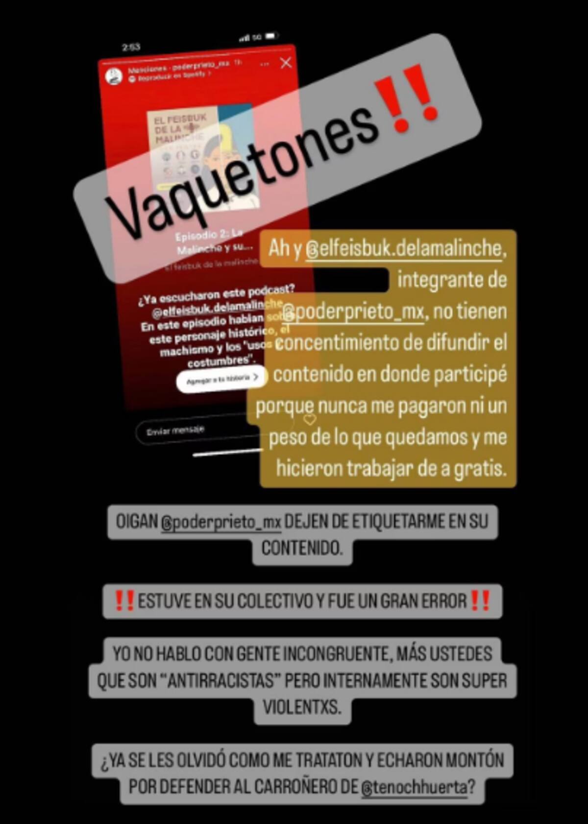 "Oye MARCA de @poderprieto_mx, NO TIENEN CONSENTIMIENTO para difundir un material por el que no me quisieron pagar y en el que me explotaron para trabajar gratis", escribió la activista.
