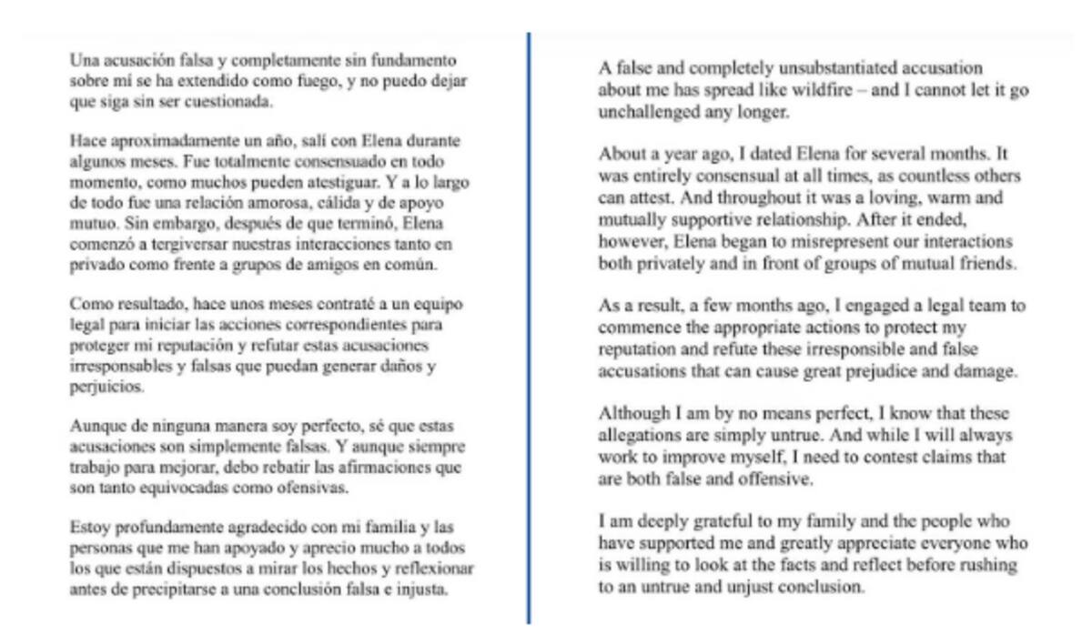 "Elena comenzó a tergiversar nuestras interacciones tanto en privado como frente a grupos de amigos en común", escribió.