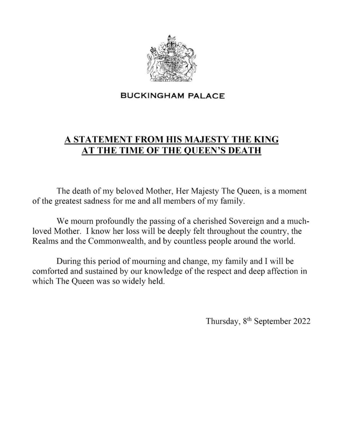 "Durante este periodo de luto y cambio, mi familia y yo nos reconfortaremos y sostendremos por el conocimiento del respeto y profundo afecto en el que se tenía a La Reina en todas partes", finaliza el comunicado.