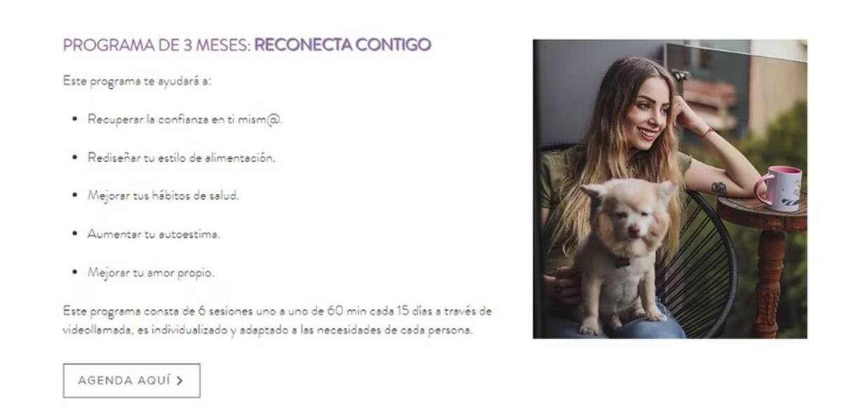 Recientemente, la influencer ha incorporado sesiones de terapia psicológica a su proyecto. Bajo el título "Reconecta contigo", este programa ofrece un periodo de 3 meses con 6 sesiones personales, a un costo de 5 mil pesos.