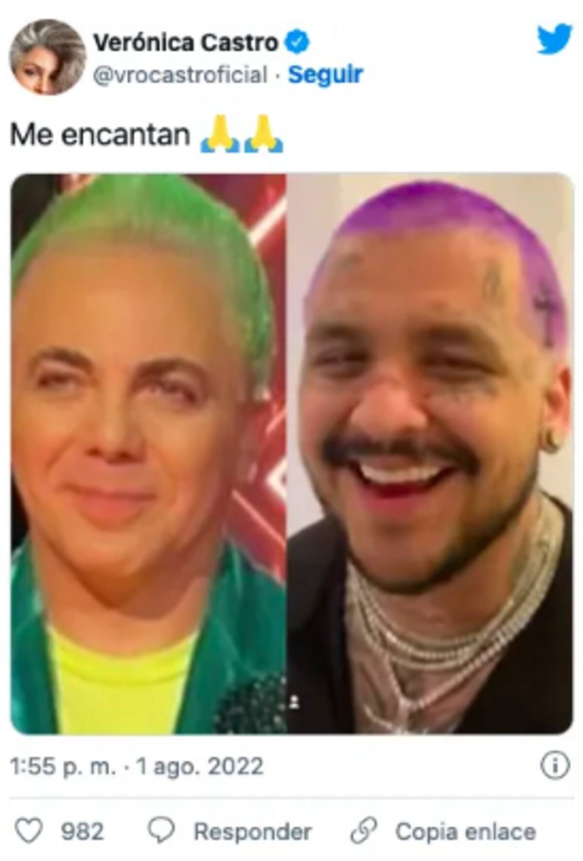 Asimismo, Verónica Castro compartió dos fotos en Twitter, una de su hijo y otra del exprometido de Belinda, donde ambos lucen el cabello teñido.