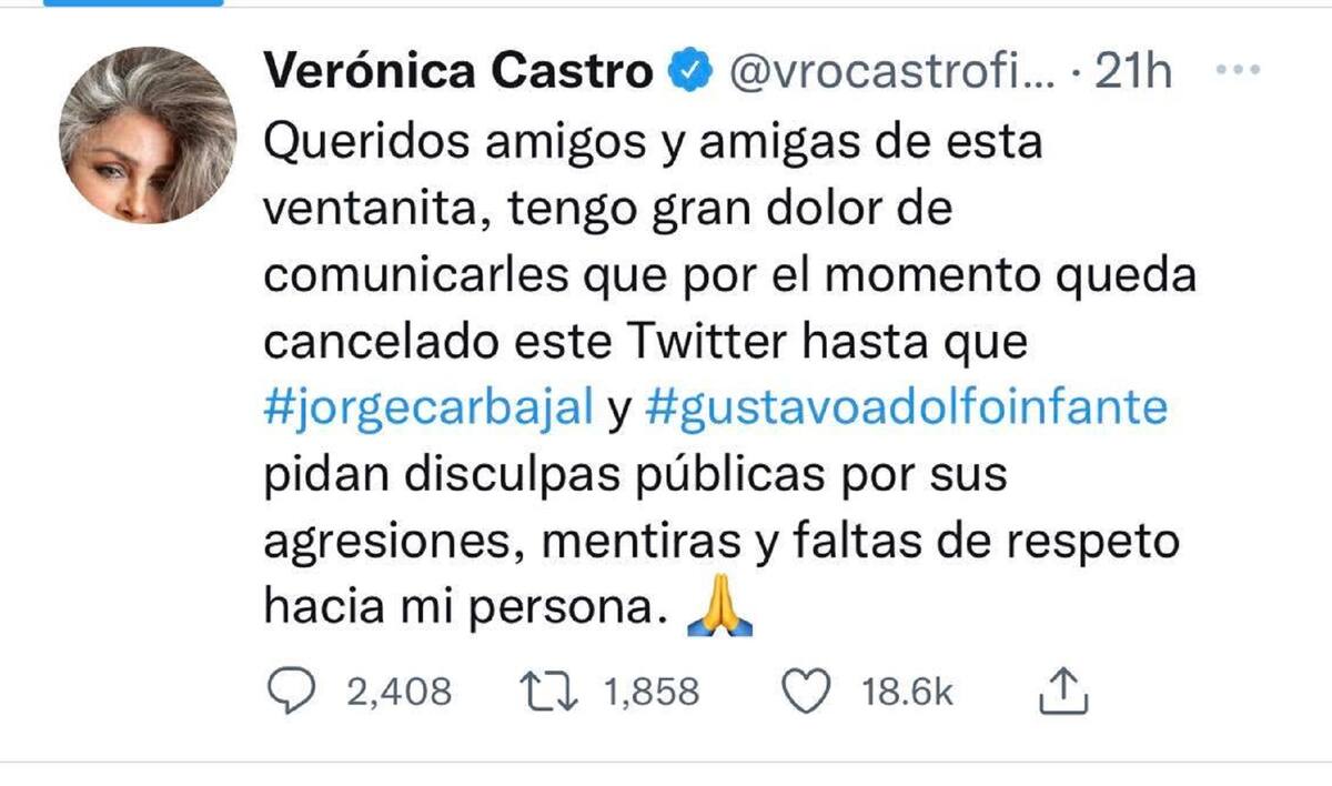 En medio de estos dimes y diretes, Verónica Castro reaccionó y les pidió tanto a Gustavo Adolfo Infante como a Jorge Carbajal que les pidieran disculpas públicas por las difamaciones que estaban haciendo en su contra.
