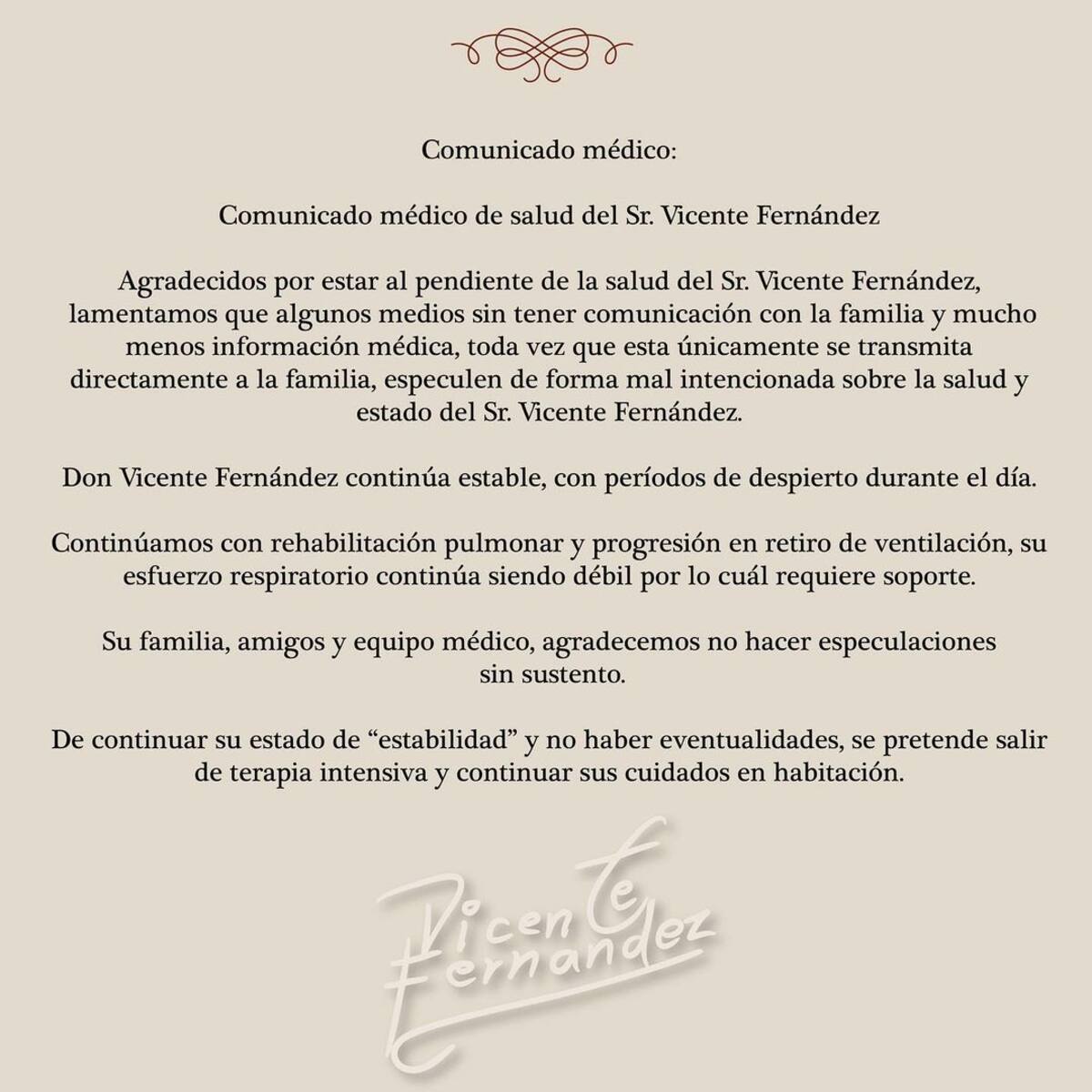 Agradecemos por estar al pendiente de la salud del Sr. Vicente Fernández, lamentamos que algunos medios sin tener comunicación con la familia y mucho menos información médica, toda vez que esta únicamente se transmita directamente a la familia, se especulen de forma mal intencionada sobre la salud y estado del cantante”, se lee en el documento.