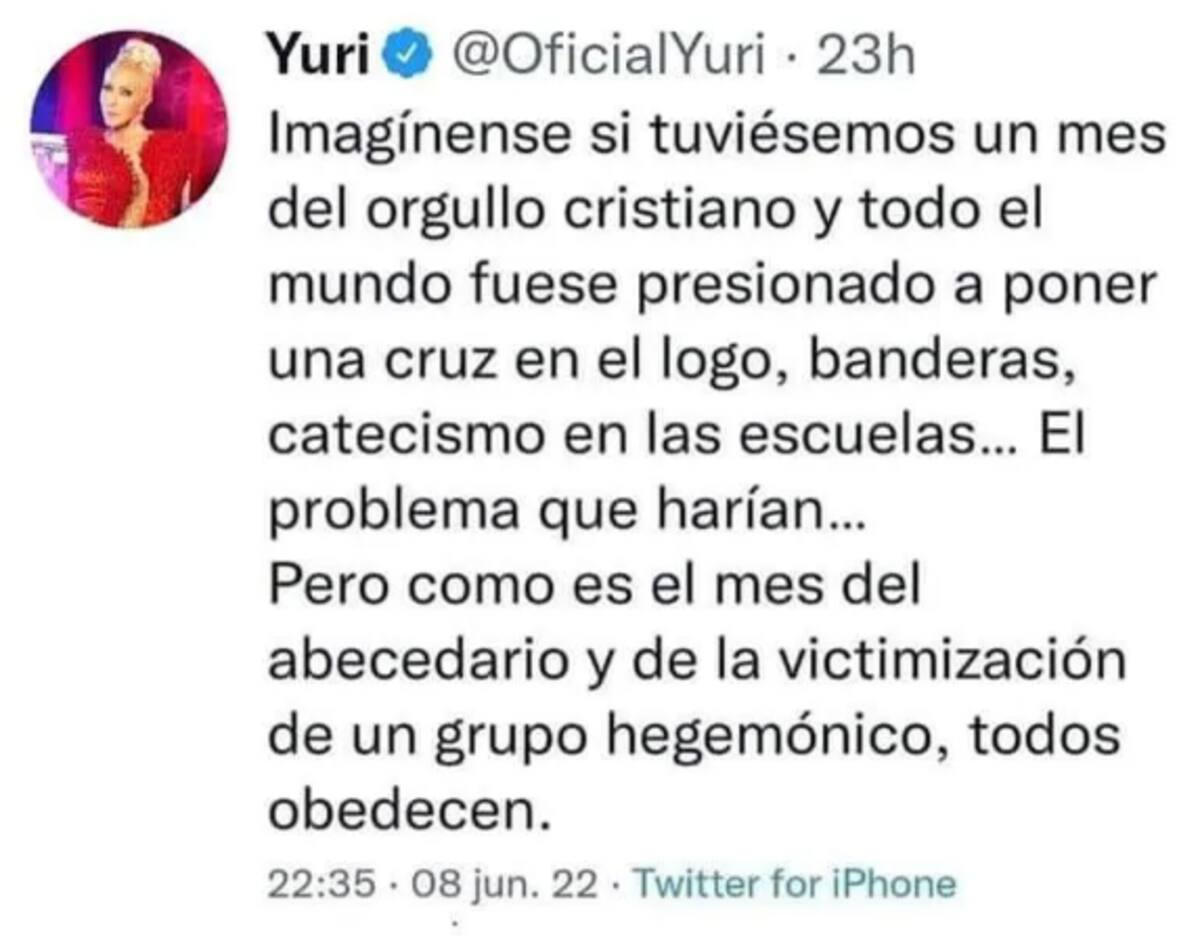 Ciudad de México.- Yuri se convirtió en blanco de duras críticas a causa de una captura de pantalla que muestra un supuesto mensaje que compartió en su cuenta de Twitter, donde propone “un mes del orgullo cristiano", en lugar de celebrar el de la comunidad LGBT+.