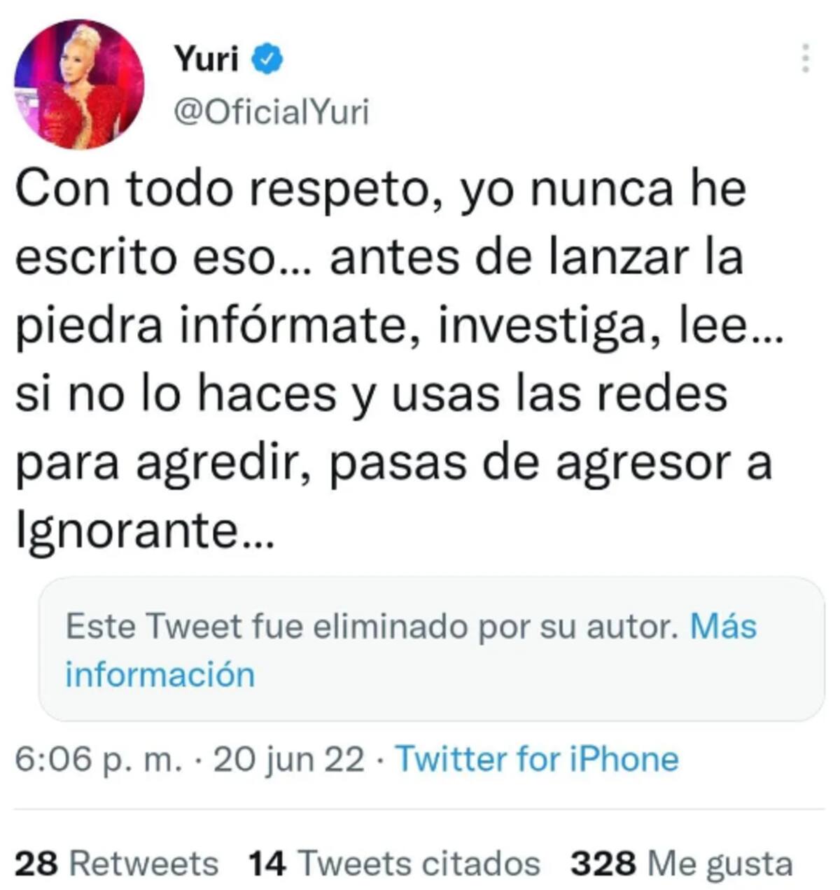 “Con todo respeto, yo nunca he escrito eso. Antes de lanzar la piedra infórmate, investiga y lee, si no lo haces y usas las redes para agredir pasas de agresor a ignorante”, fue el contundente mensaje que escribió Yuri en su cuenta de Twitter.