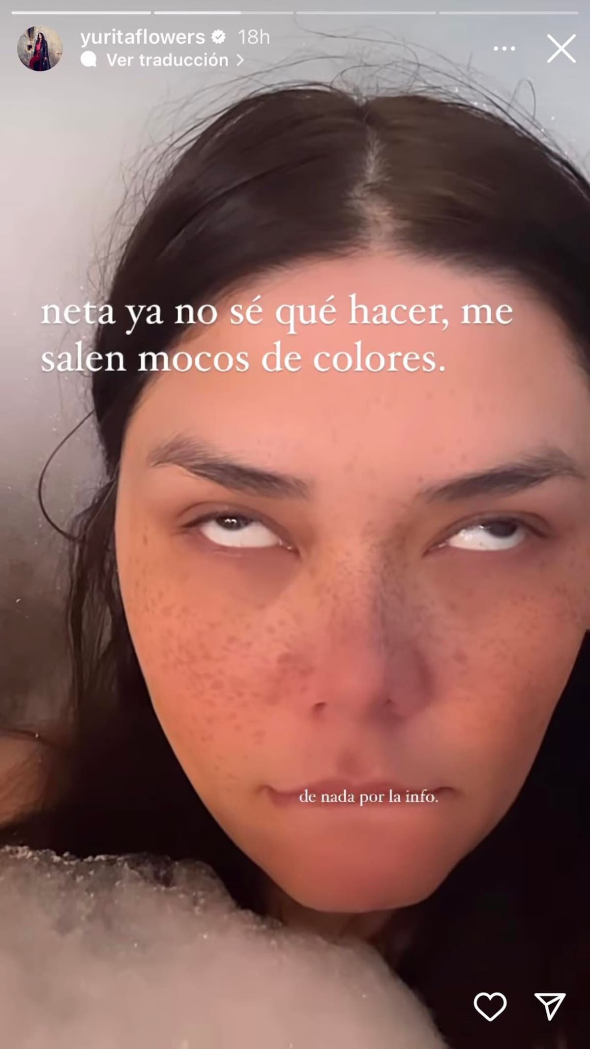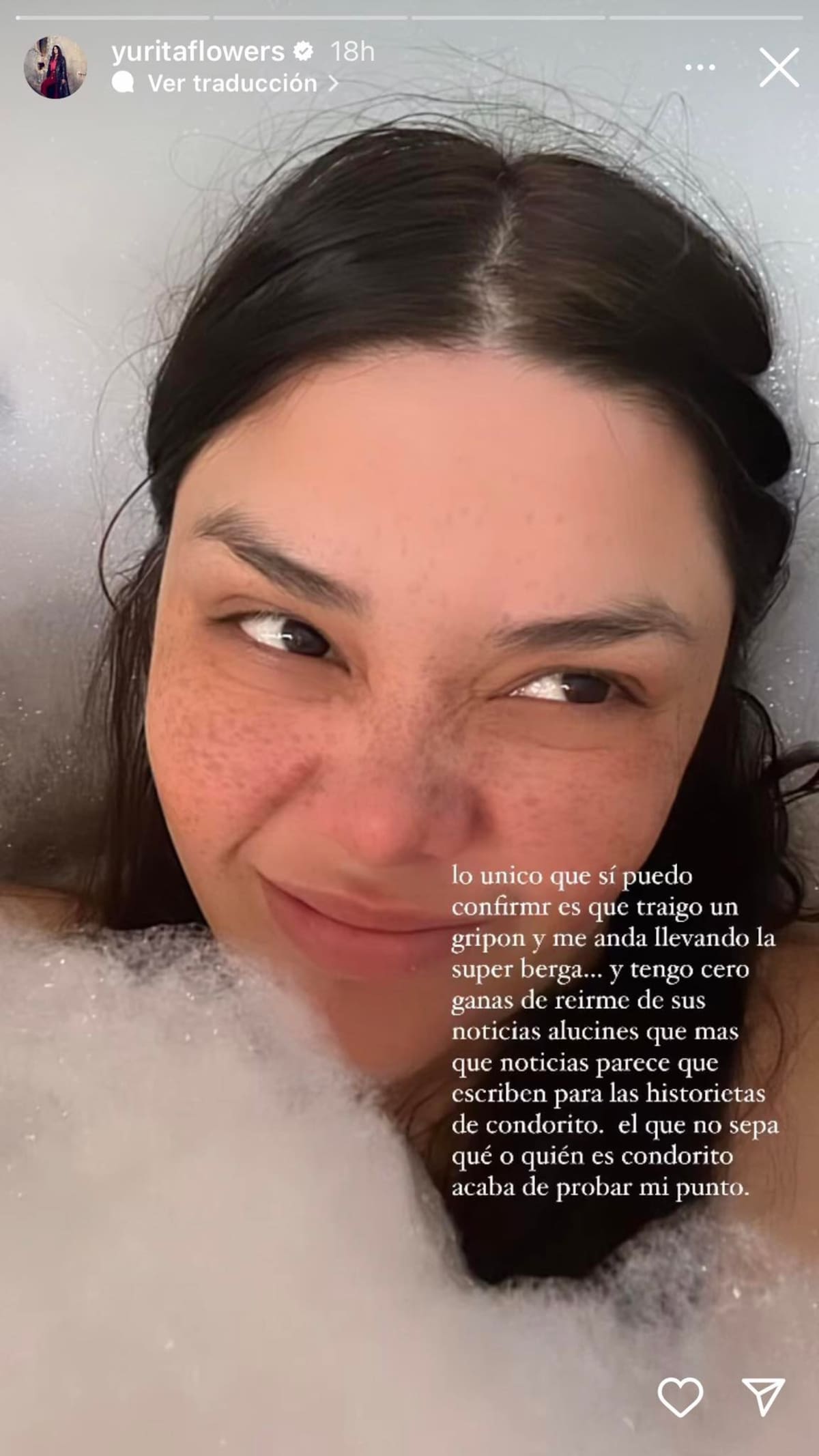 Lo único que sí puedo confirmar es que traigo un gripón y me anda llevando la super verg*…y tengo cero ganas de reírme de sus noticias alucines, que más que noticias parece que escriben para las historietas de Condorito, el que no sepa quién o qué es Condorito acaba de probar mi punto”, escribió Yuridia sobre una foto donde estaba tomando un baño de burbujas.