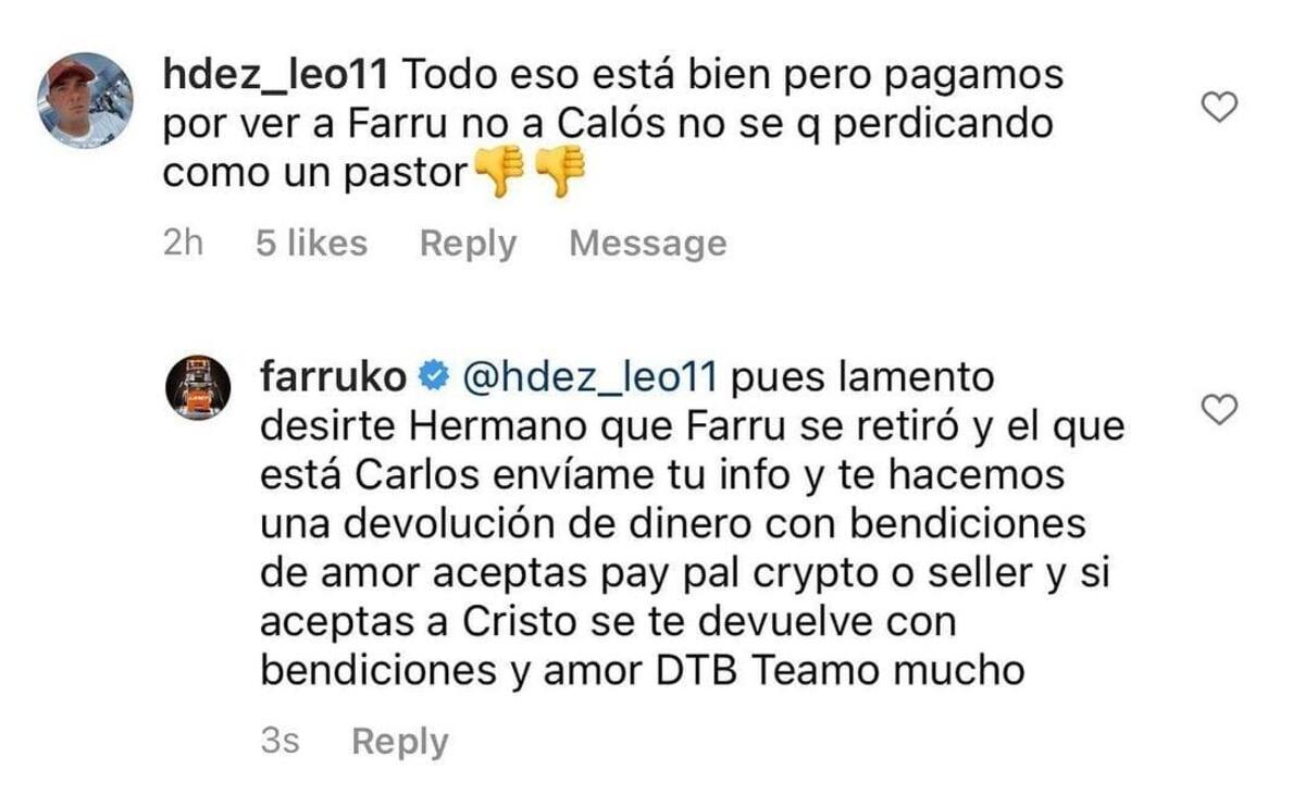 Este sábado, Farruko escribió a través de sus redes sociales que “Lamento verdad los q van a ver a Farru están a tiempo de no ir y se les puede hacer un reembolso los q vayan y quieran una nueva experiencia de amor son bienvenidos así solo vaya 1 ahí estaré y los amare igual vayan o no vayan!! Están a Tiempo para q no gasten su dinero ni tiempo en vida eterna y armonia los amo. El culto hoy es en Fortmyers Nadie está obligado hay más artistas q usted puede seguir y ir a ver solo estoy cumpliendo mis compromisos por q soy de palabra y debo un respeto a mis fans y Dios es un Dios de orden y la plataforma q me quede la voy a utilizar para llevar el mensaje los amo”.